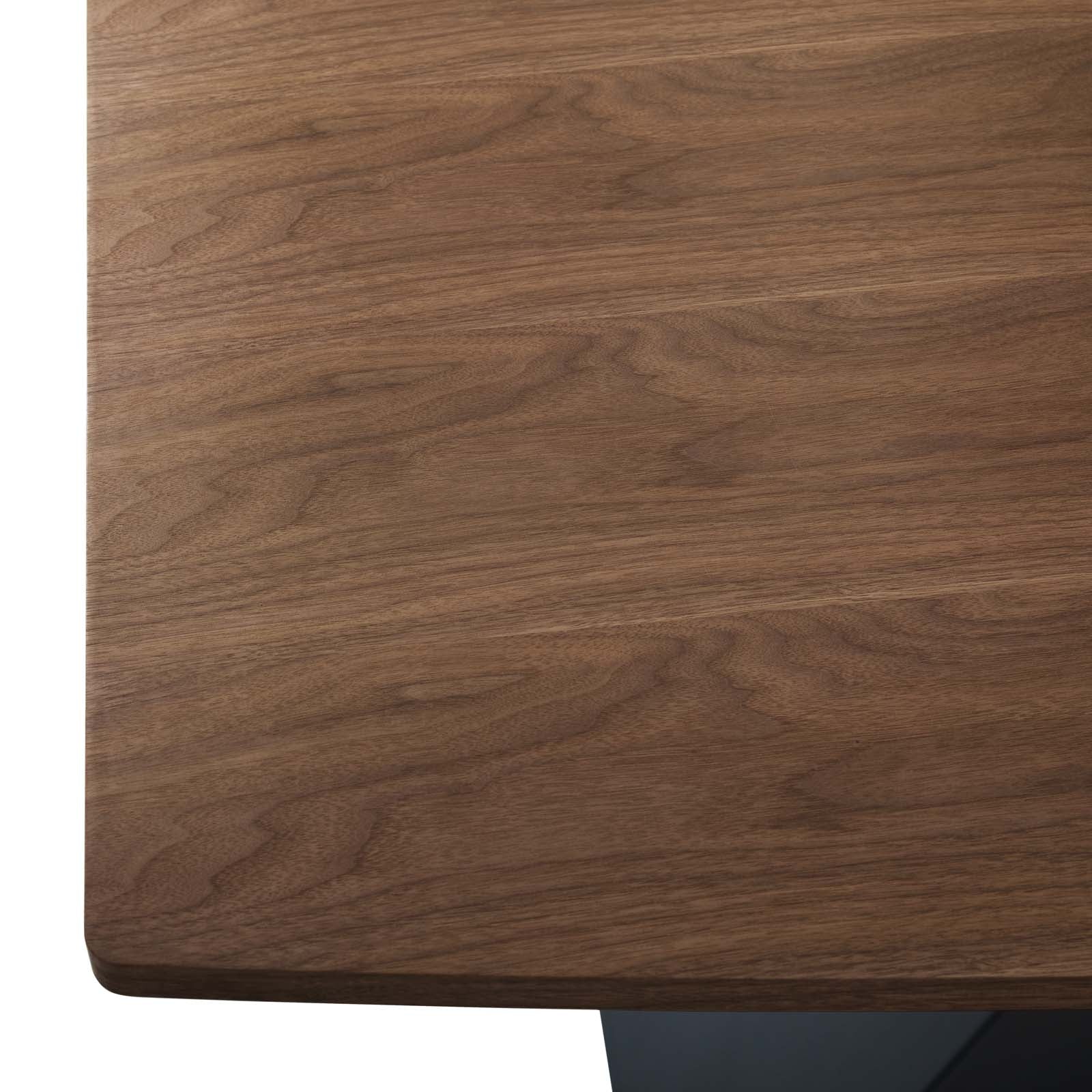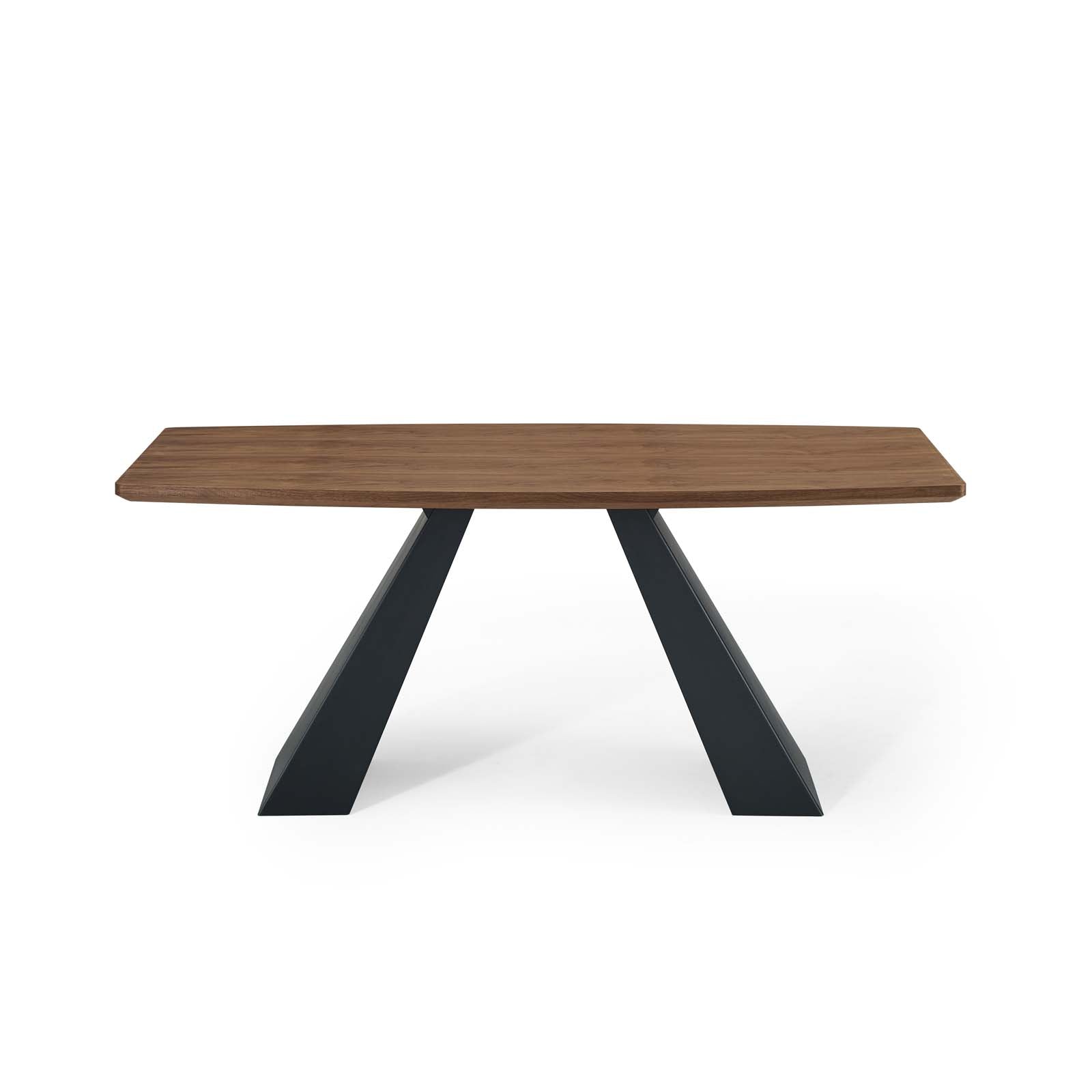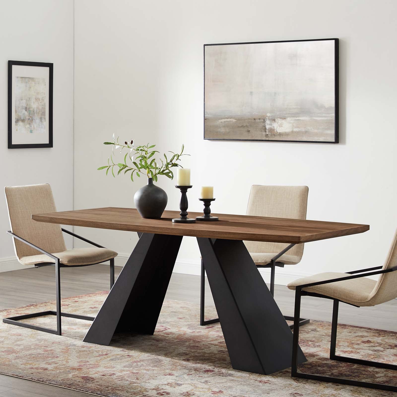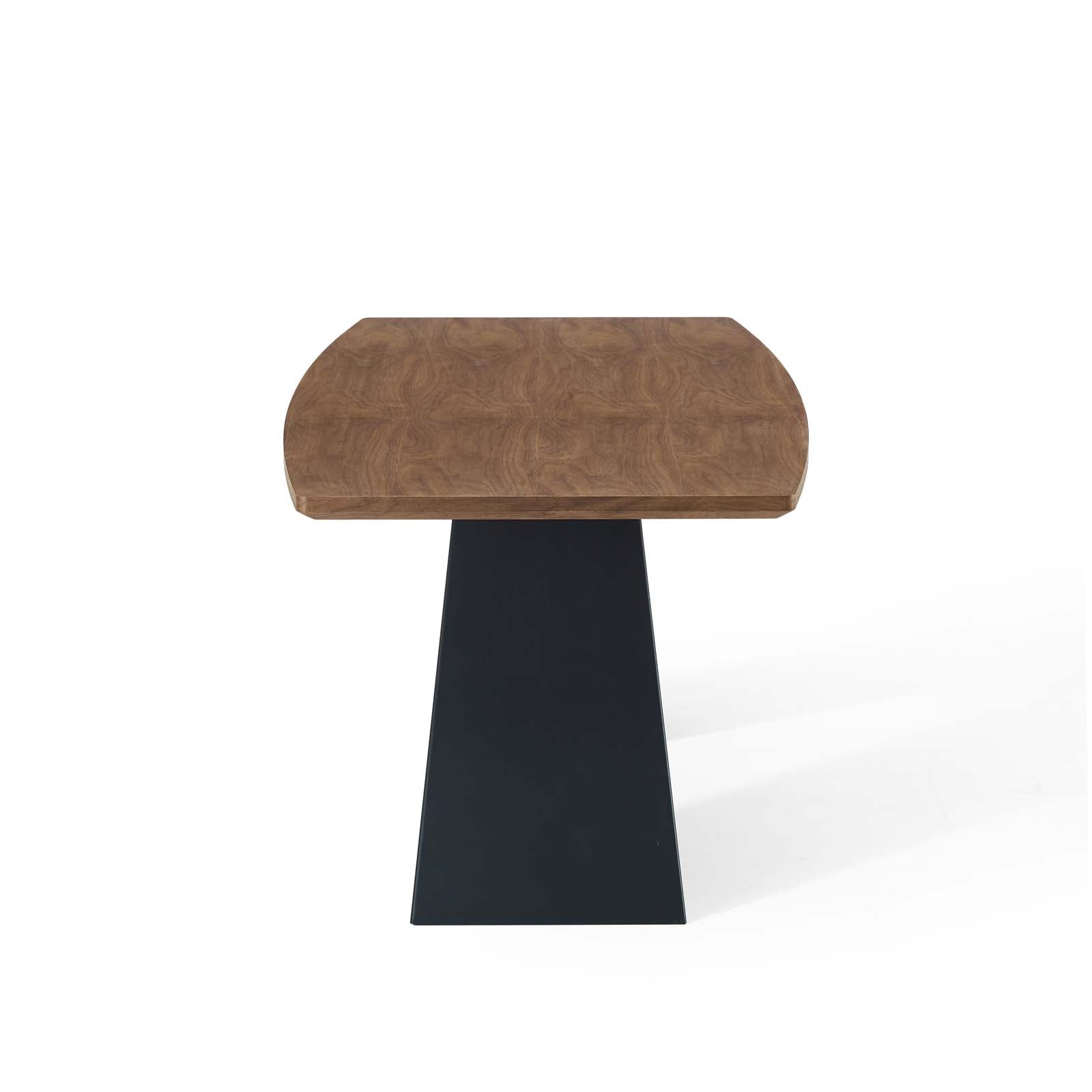 Angular expanse rises gracefully from the Elevate 71” Dining Room Table. The rectangular walnut grain veneer top with subtle curved edges is supported by a triangulated matte black iron base with non-marking foot caps. The Elevate Dining Table is an eye-catching addition to your dining room and kitchen decor, and its versatile construction features elegance suitable for an executive conference room. Solidly crafted from wood and MDF, this dining table boasts sloped edges and striking angular detail. Assembly Required. Set Includes: One - Elevate Dining Table