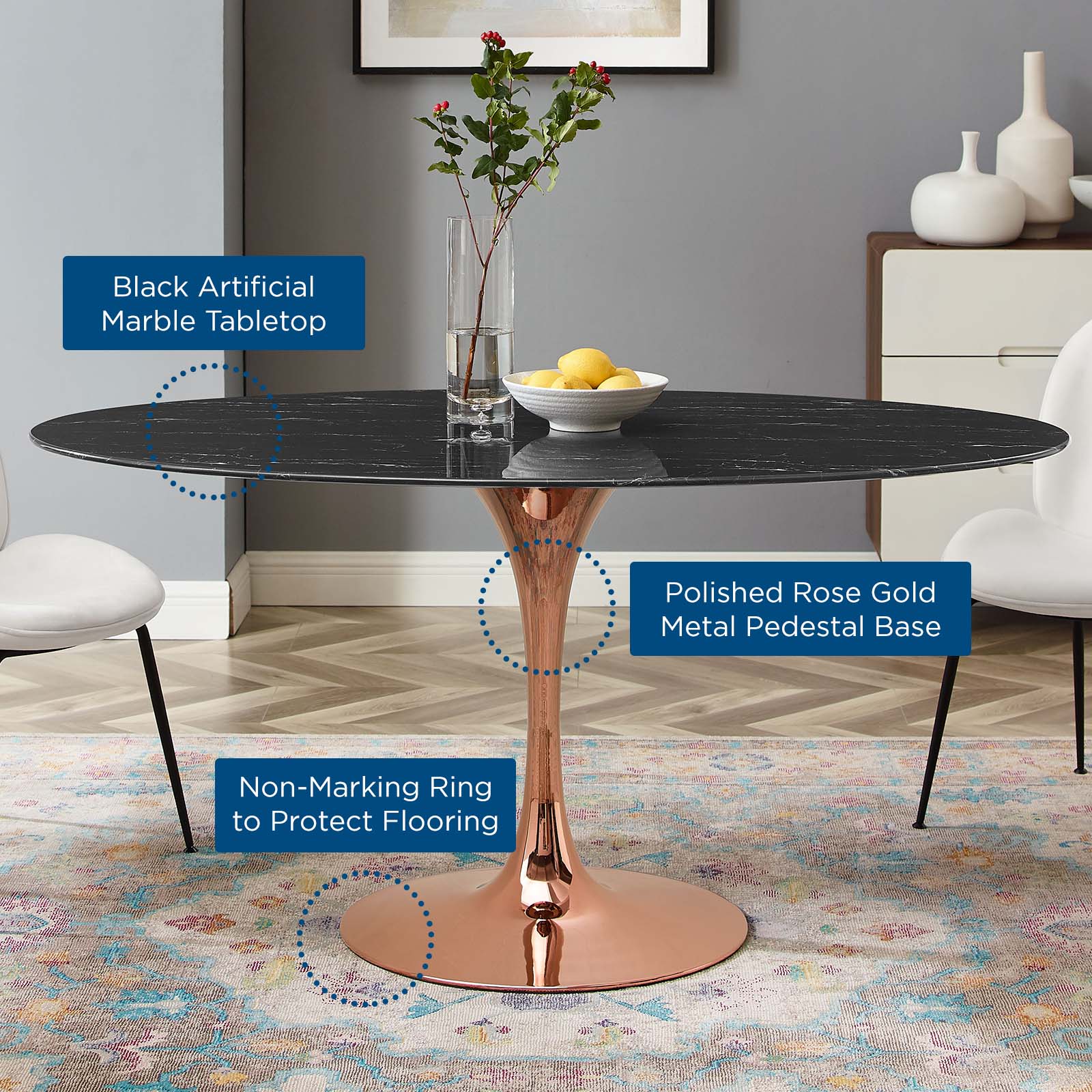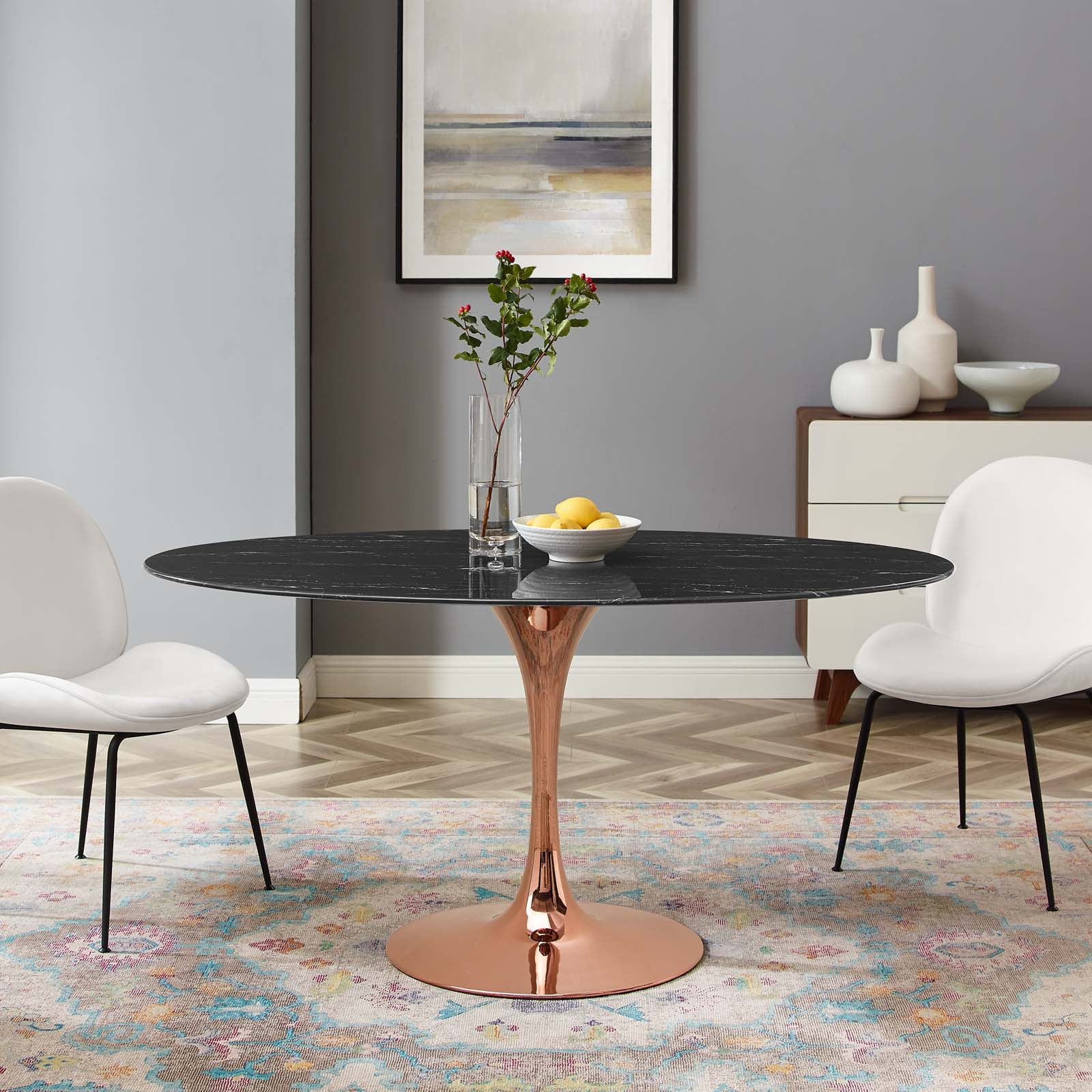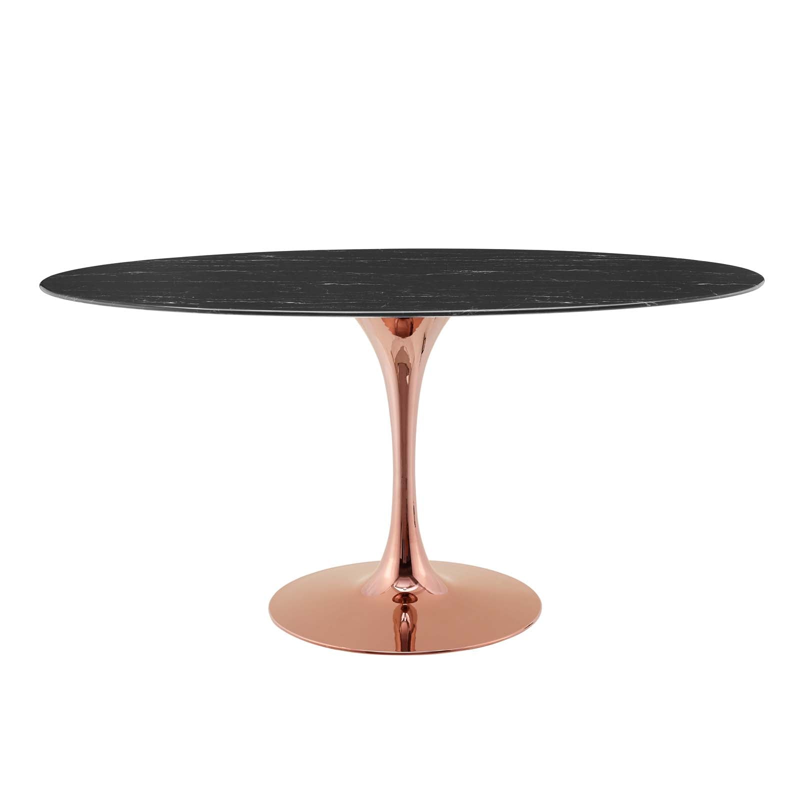 Reflecting a seamless organic shape and timeless form, the Lippa dining table has become a symbol of modernism for over the past 60 years. Before its release, homes were filled with clunky remnants of an industrial age long gone by. But in order to advance into the new world, homes first had to transition from the traditional square table, into a piece that connoted progress. The base and dimensions are true to the original specifications, while the table’s oval artificial marble top features a scratch-resistant finish, and the metal tapered base features a polished rose gold finish. Set Includes: One - Lippa 60" Oval Dining Table