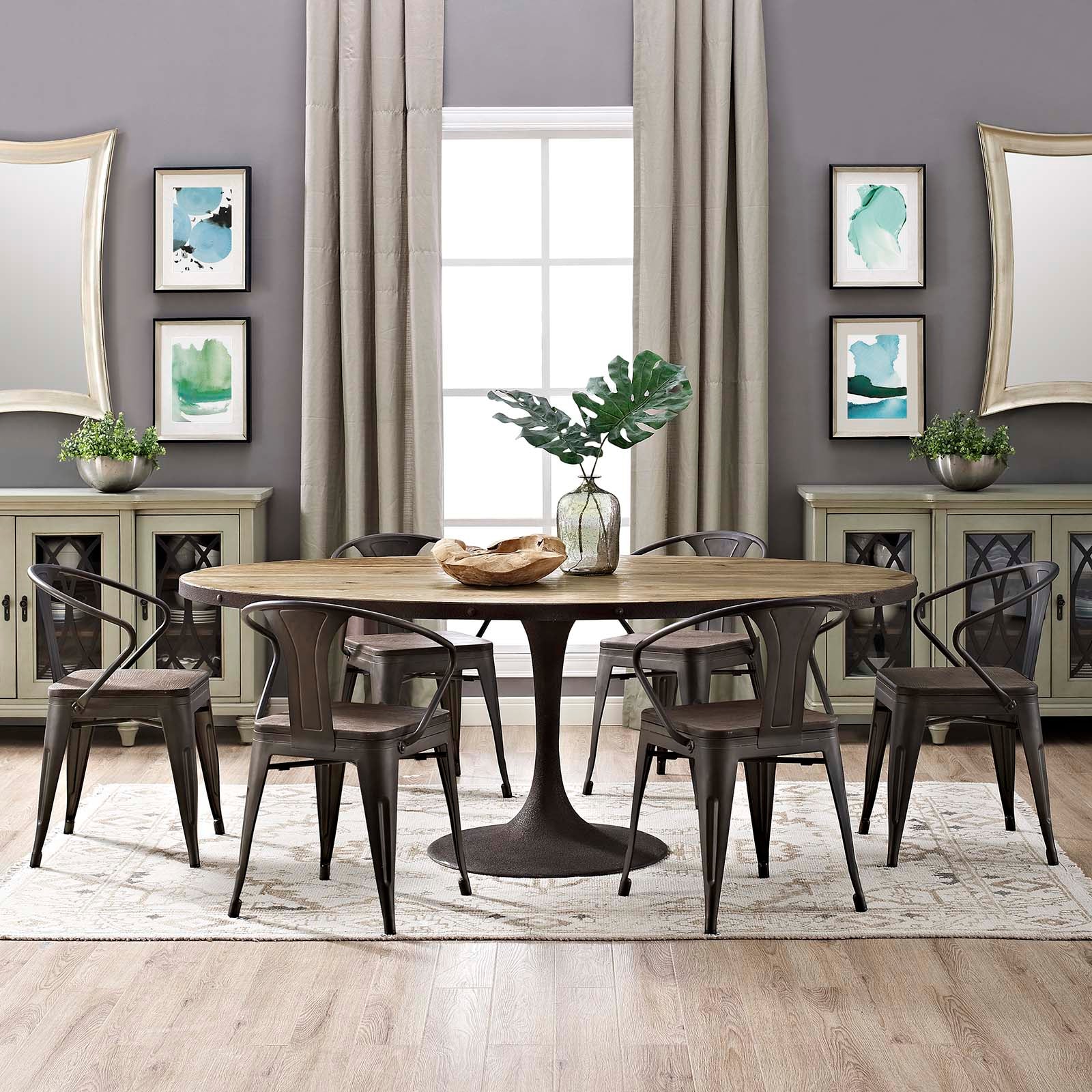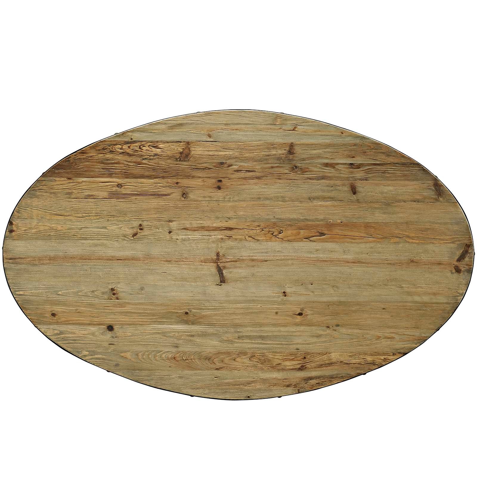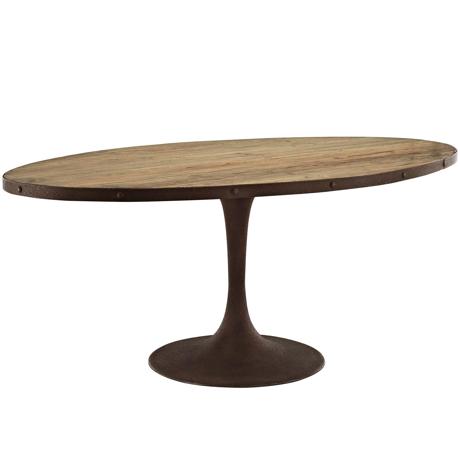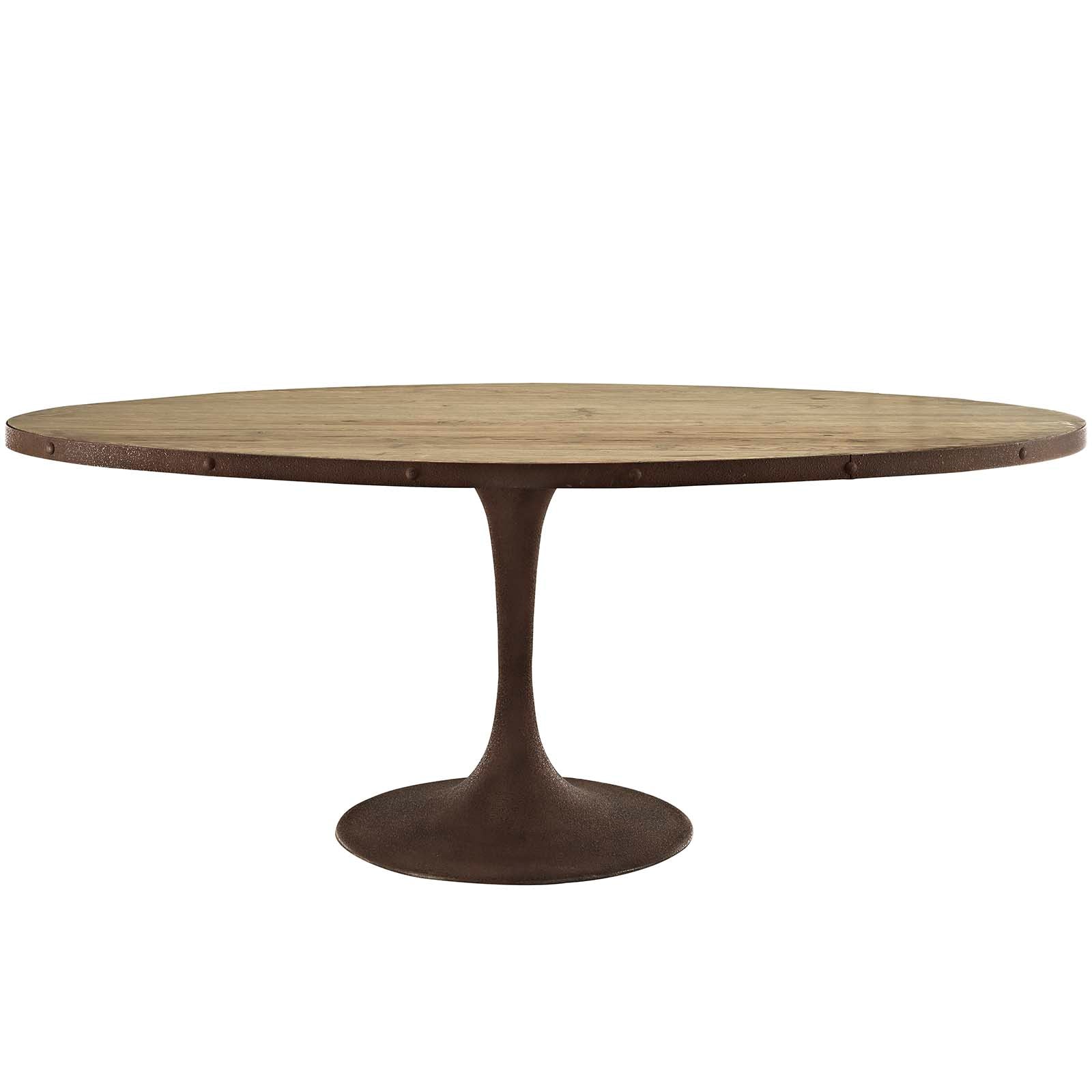 Deliberately implement down-to-earth aesthetics with the Drive industrial modern oval dining table. Fashioned on a cast iron pedestal base, the oval pine top is braced in a rim of iron to connote progress amidst rustic conditions. In contrast to the standard four-legged tables, the single stand variety has been gaining popularity over the past 60 years. Now with the resurgence of industrial modernism, the warehouse of yesteryear comes remodeled into its present stance as an artform. Set Includes: One - Drive 78" Oval Dining Table