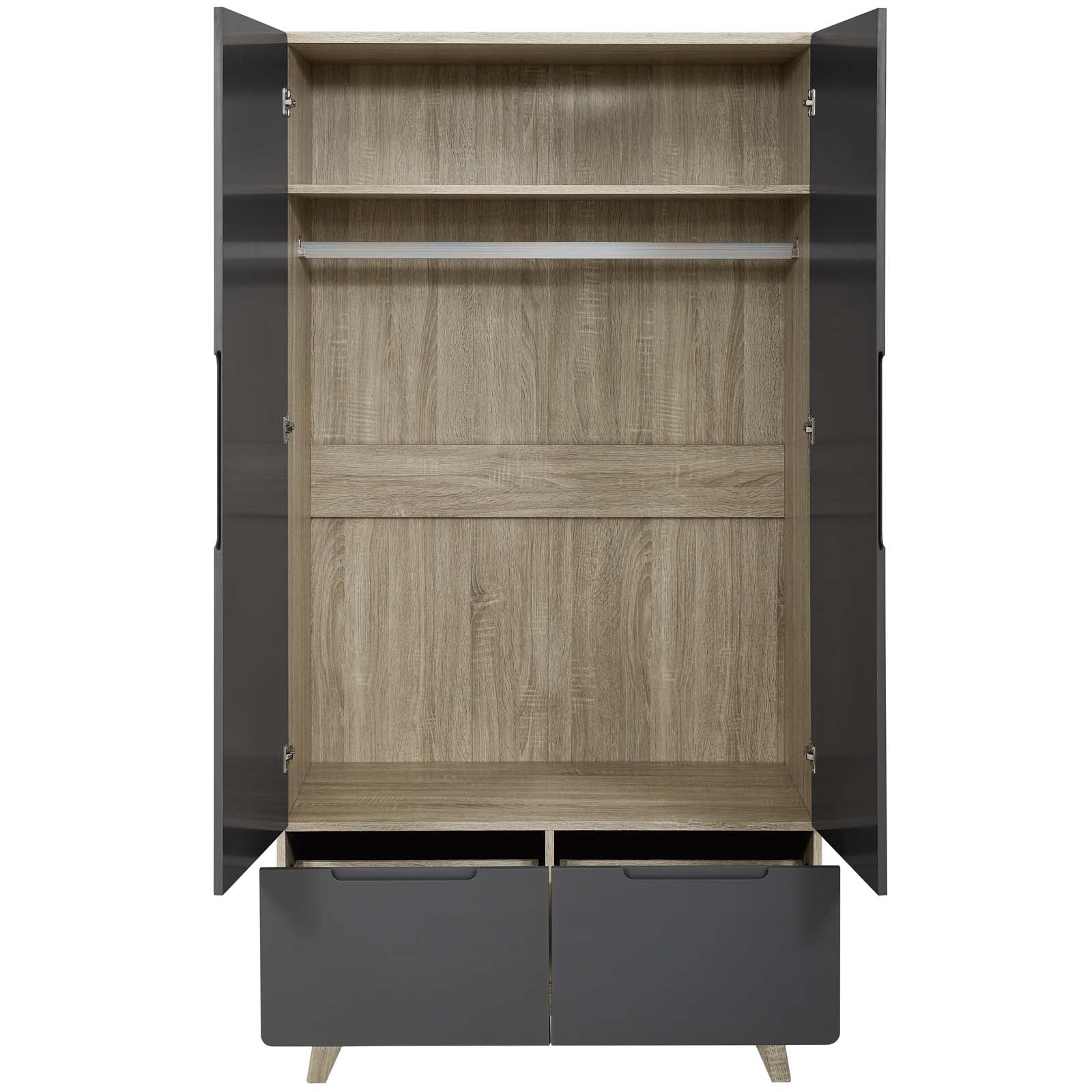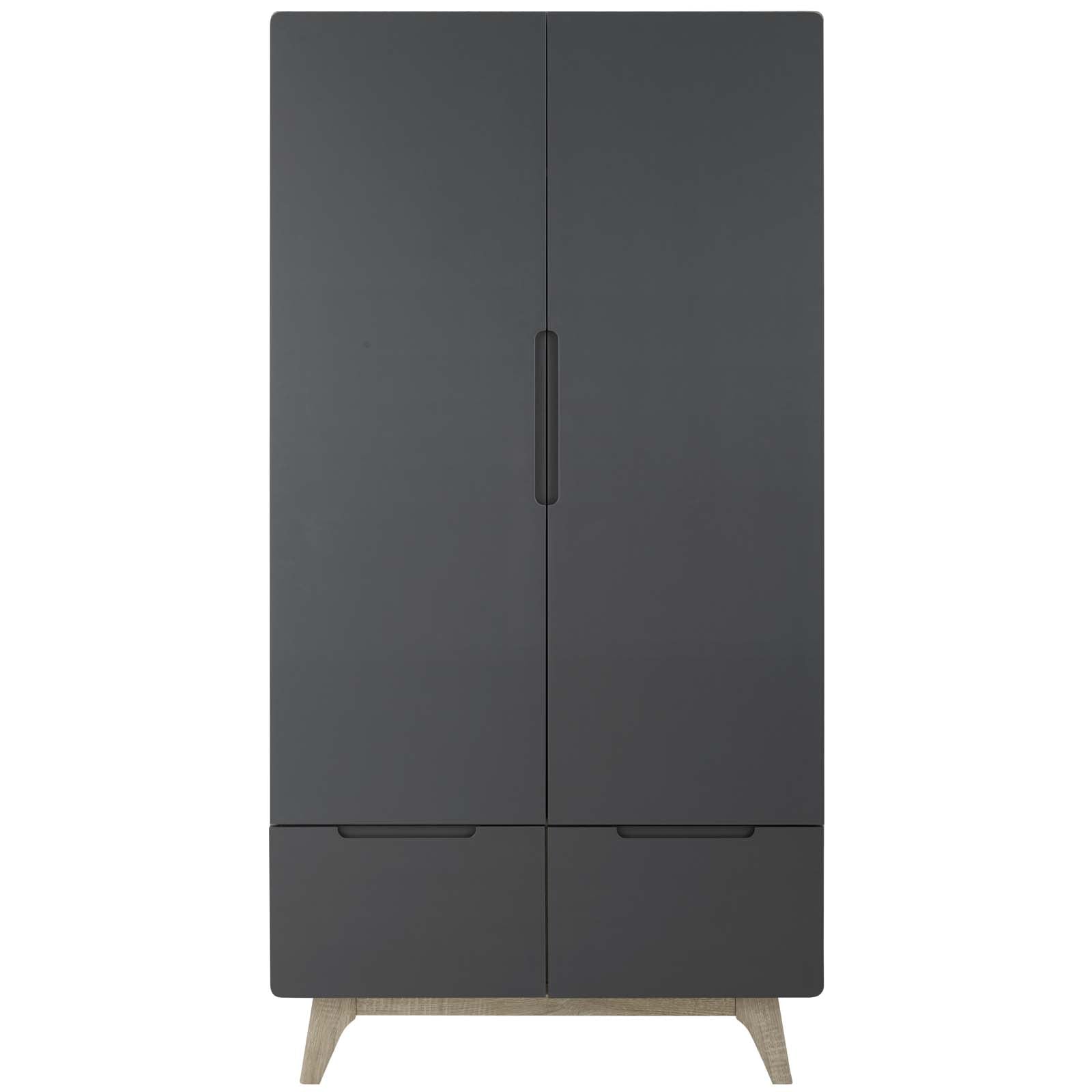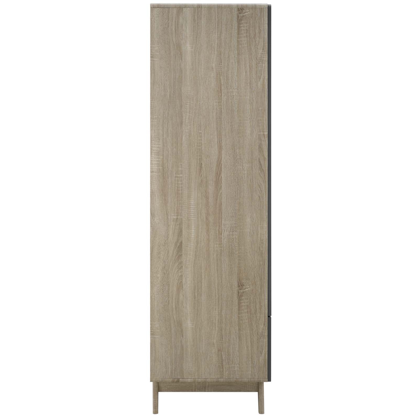 Bring the iconic energy of mid-century style to your bedroom or living room with the Origin Wardrobe Cabinet. Crafted with durable fiberboard for reliable support, Origin comes with a splayed frame, rounded edges, linear design, wood grain laminate, two doors with a sturdy crossbar for hanging shirts, coats, pants, and jackets, upper shelf space, and two full-extension storage drawers for to organize and storage smaller items. The perfect complement to your bedroom decor, organize your clothing today with the Origin Wardrobe Cabinet. Set Includes: One - Origin Wardrobe Cabinet