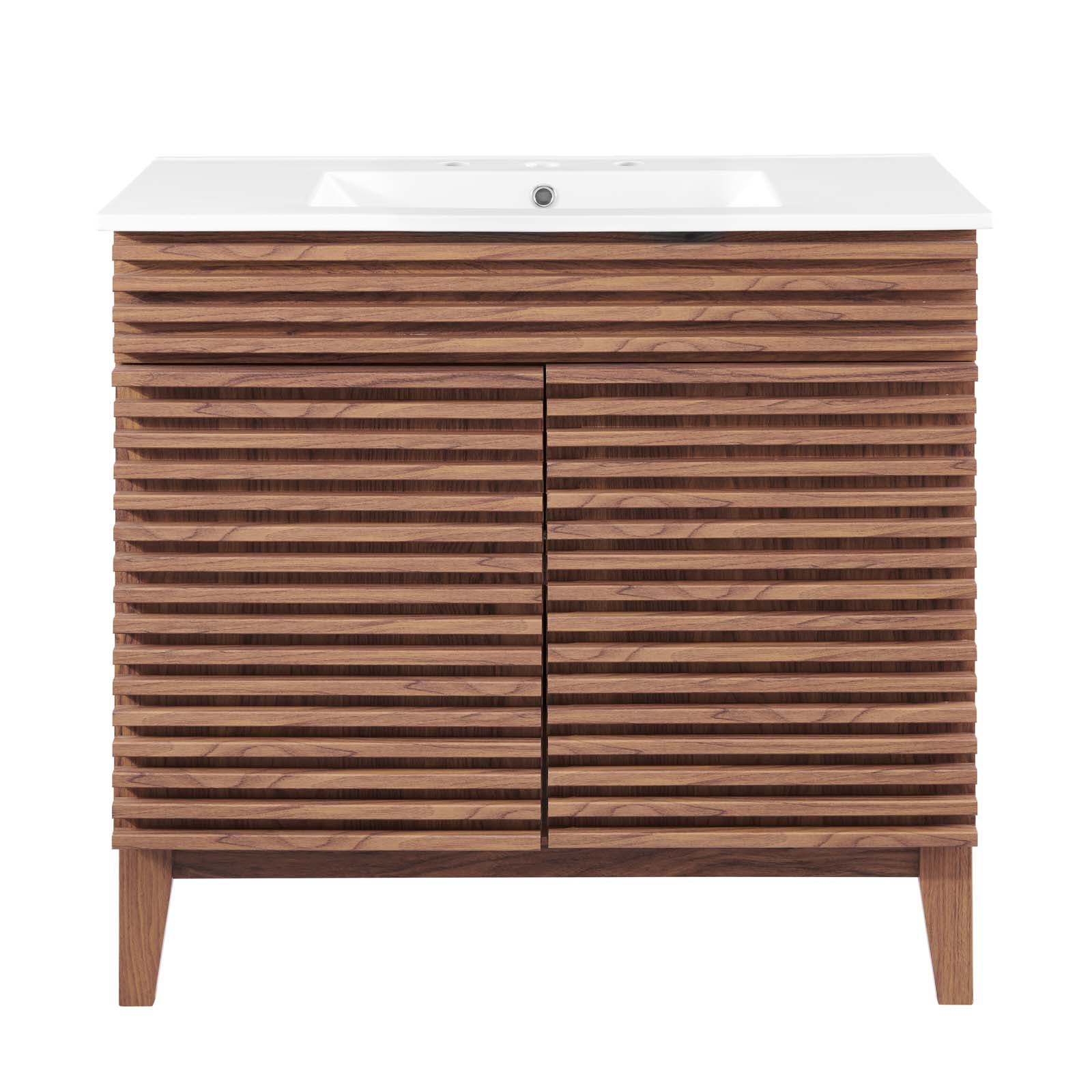 Tap into mid-century aesthetics with the Render Vanity. The Render 36" Bathroom Vanity features a durable MDF and particleboard frame with smooth walnut grain laminate, four tapered wood legs, and ample storage space behind two soft-close hinged doors. Crafted with ceramic, a single sink with an integrated countertop, 8" centerset, and rectangular sink basin continue the sleek look of this retro modern vanity. Clean lines and crisp design align for an edgy style designed to meet your needs. Boasting a mid-century modern style this vanity features a solid construction with a pleasing look and practical functionality. Assembly required and fixtures not included. Set Includes: One - Render 36" Bathroom Vanity