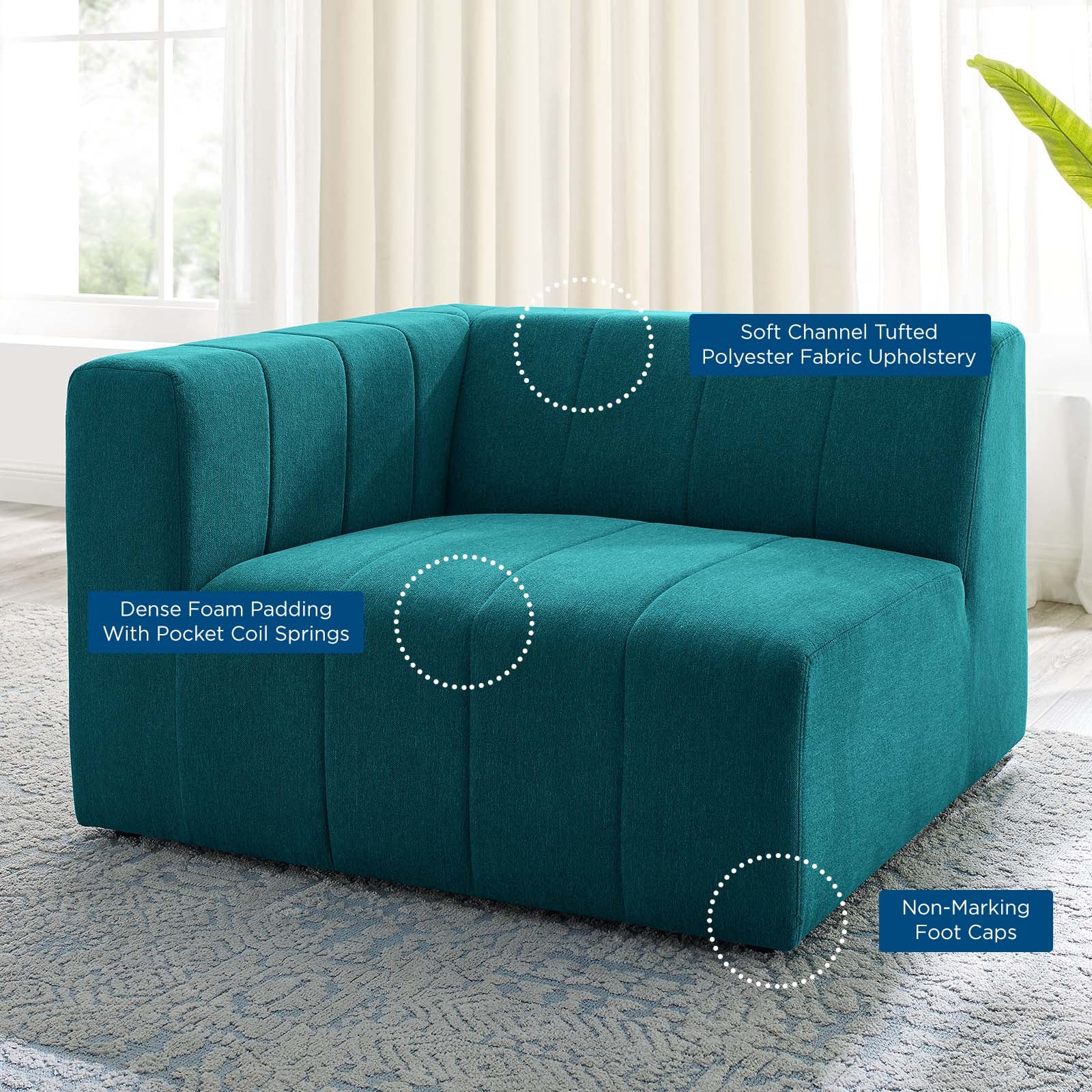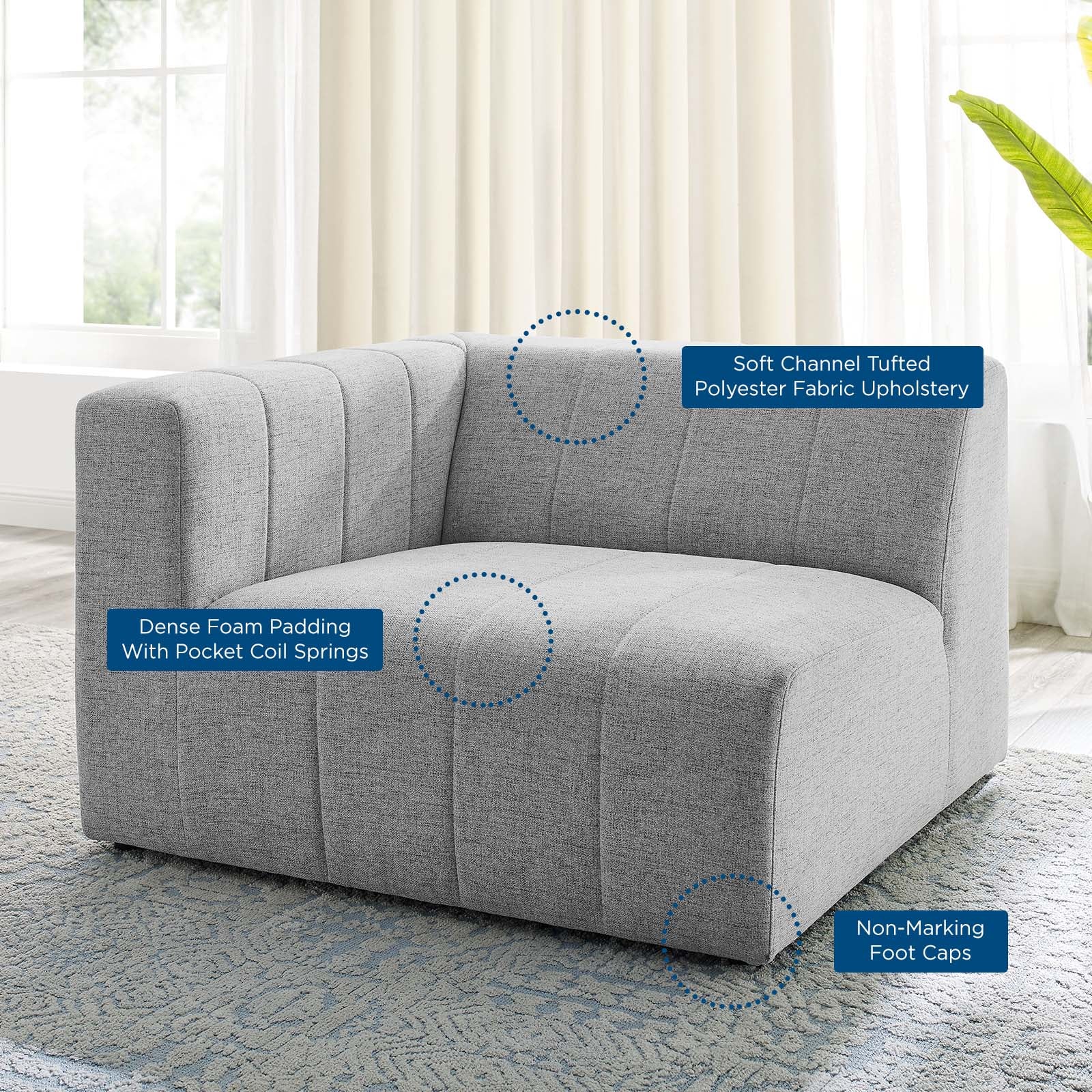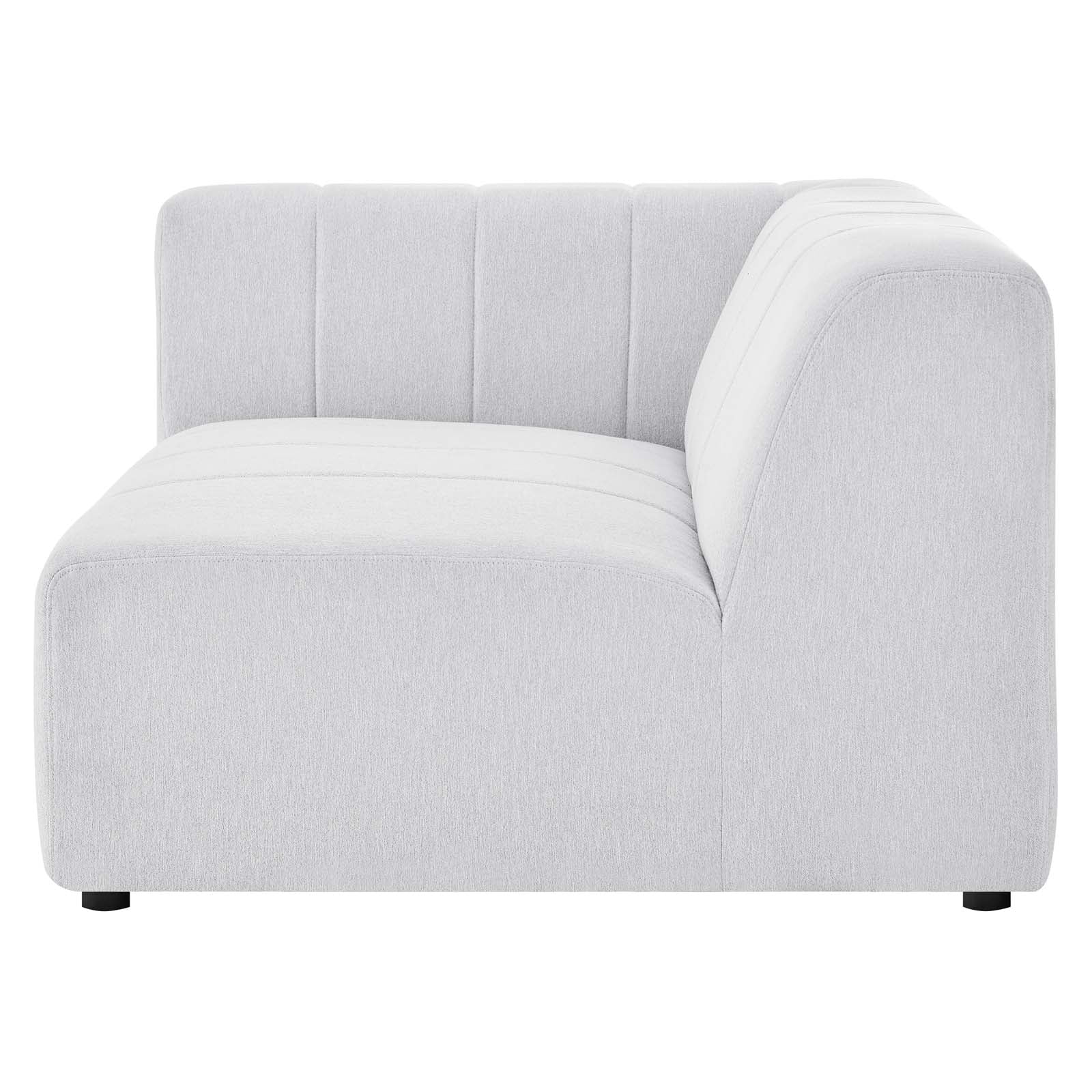 Indulge in comfort and relaxation by creating a custom living room and lounge area with the Bartlett Upholstered Fabric Left-Arm Chair. Featuring subtle channel tufting, rounded corners, and soft polyester fabric upholstery, this sectional sofa left-arm chair brings retro modern style and contemporary allure to your living space. Dense foam padding and a pocket coil spring system in the cushions offer a luxe seating experience with premium support and comfort. With a sturdy frame crafted from solid wood and plywood, this living room chair features modular connectors to keep each sectional sofa piece secure and non-marking foot caps to protect flooring. Chair Weight Capacity: 331 lbs. Set Includes: One - Bartlett Left-Arm Chair