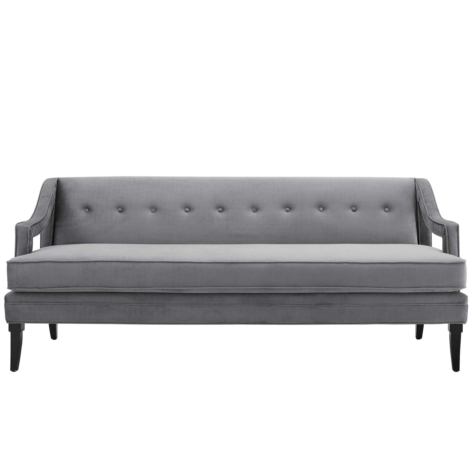 Elevate your home with the streamlined, chic cutout profile of the Concur Performance Velvet Sofa. Upholstered in soft, stain-resistant performance velvet, Concur comes with a plush 6" thick, three-seater cushion, machine washable cover, and solid birch wood saber legs with non-marking foot caps. Adorned with sloping armrests, a tailored profile, and classic button tufting, this upholstered living room sofa makes a striking statement in a variety of modern and mid-century themed decors. Sofa Weight Capacity: 1323 lbs. Set Includes: One - Concur Button Tufted Sofa