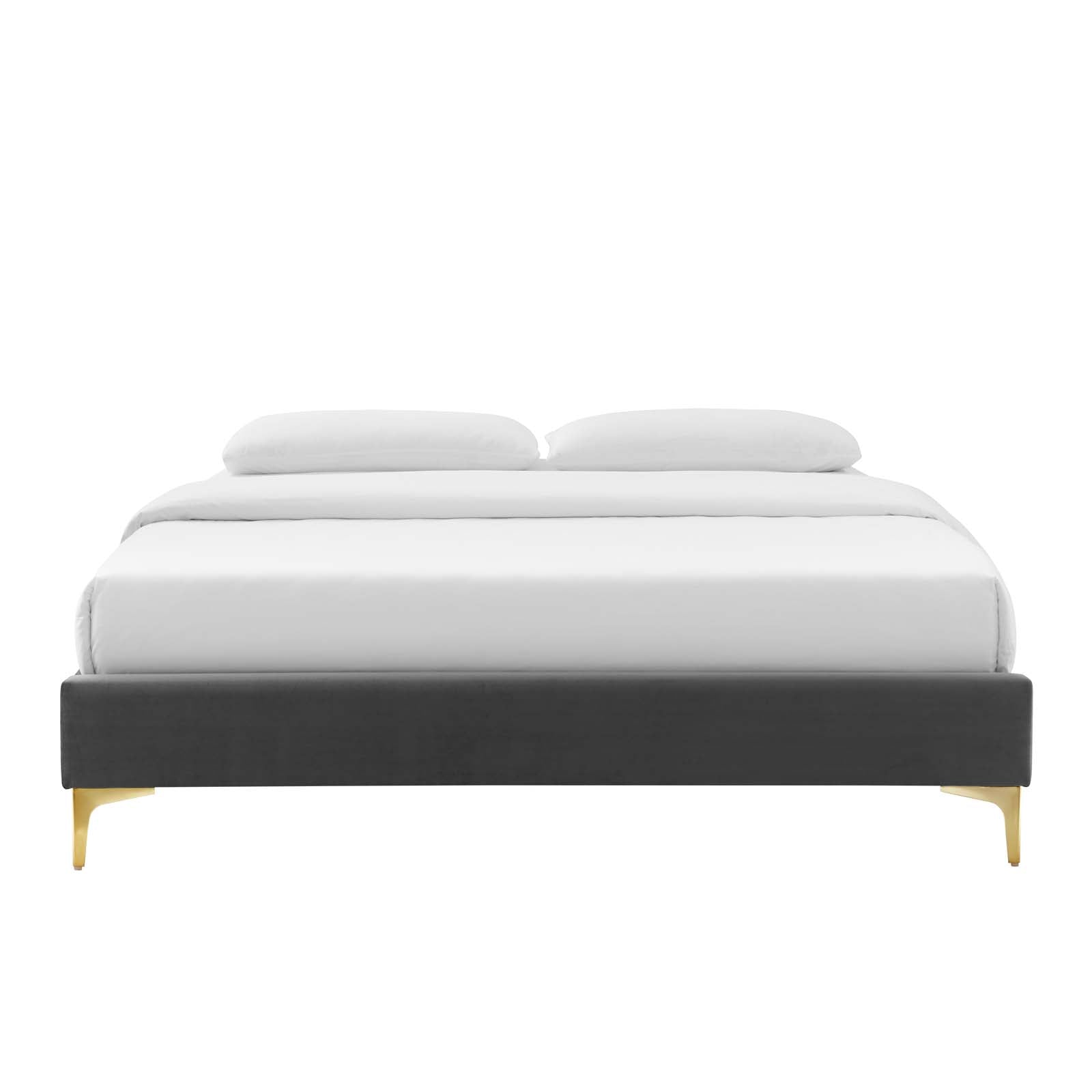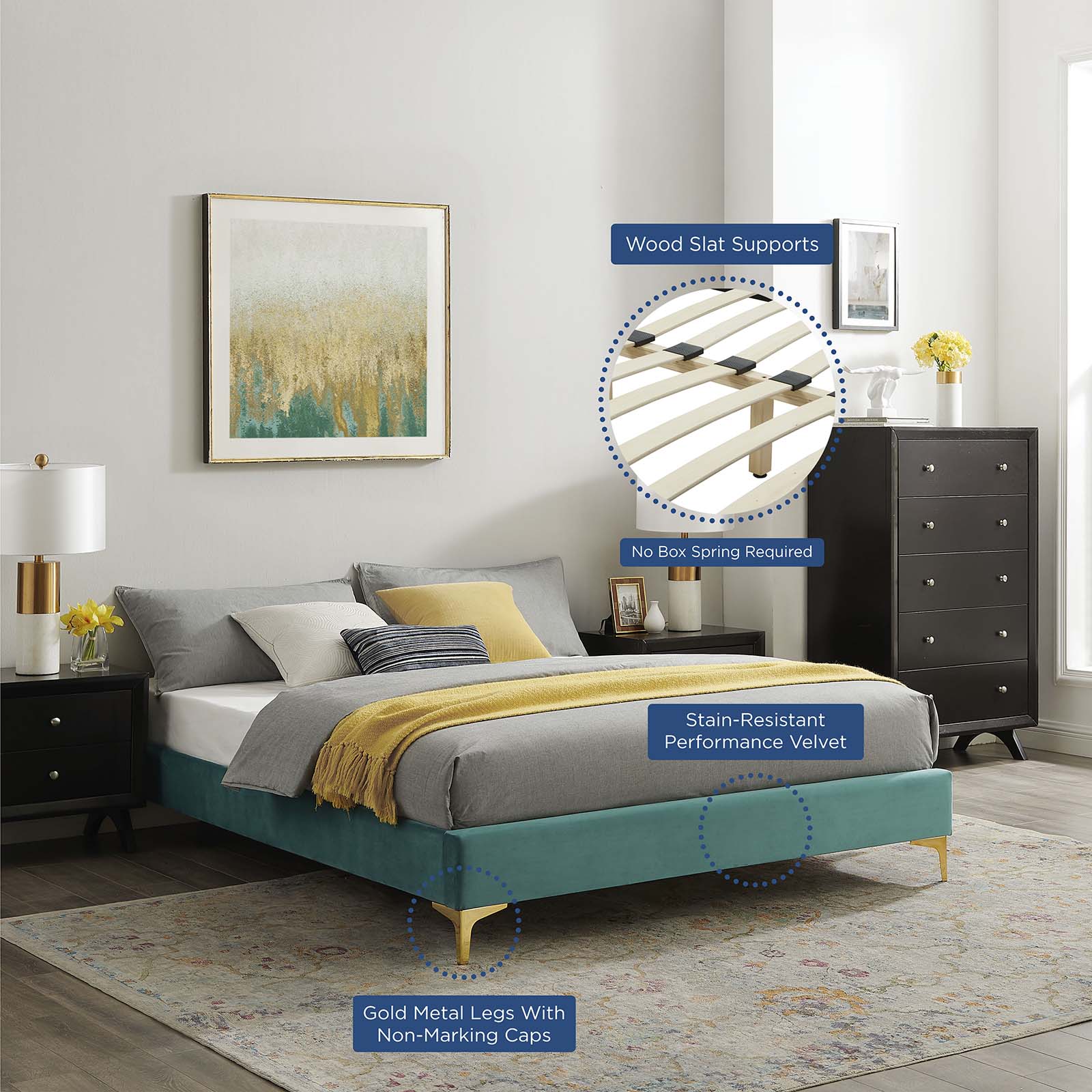 Uplift your master bedroom or guest bedroom decor with the Sutton Performance Velvet King Bed Frame. A King size bed frame covered in stain-resistant performance velvet, this upholstered bed frame is a sturdy mattress foundation for memory foam, innerspring, latex, and hybrid mattresses. Eliminating the need for a box spring, the MDF frame of this King bed is complete with a wood slat support system crafted with poplar for lasting durability and support. This slatted bed frame rests on gold metal legs with non-marking foot caps and includes a reinforced center beam with two support legs for enhanced stability. The Sutton Bed Frame is compatible with a variety of different headboard styles, or makes a statement as a stand-alone piece in the bedroom. Bed frame interchangeable with Paige, Alyson, Angela, Veronique, Evelyn, Dawn, Cecilia, Lucia, Rosalind, Delilah, Greta, Louisa, Eloise, Daisy, Sadie, Sloane, Fallon, and Lizzy. Mattress not included. Assembly required. King Size Bed Frame Weight Capacity: 800 lbs. Set Includes: One - Sutton King Bed Frame