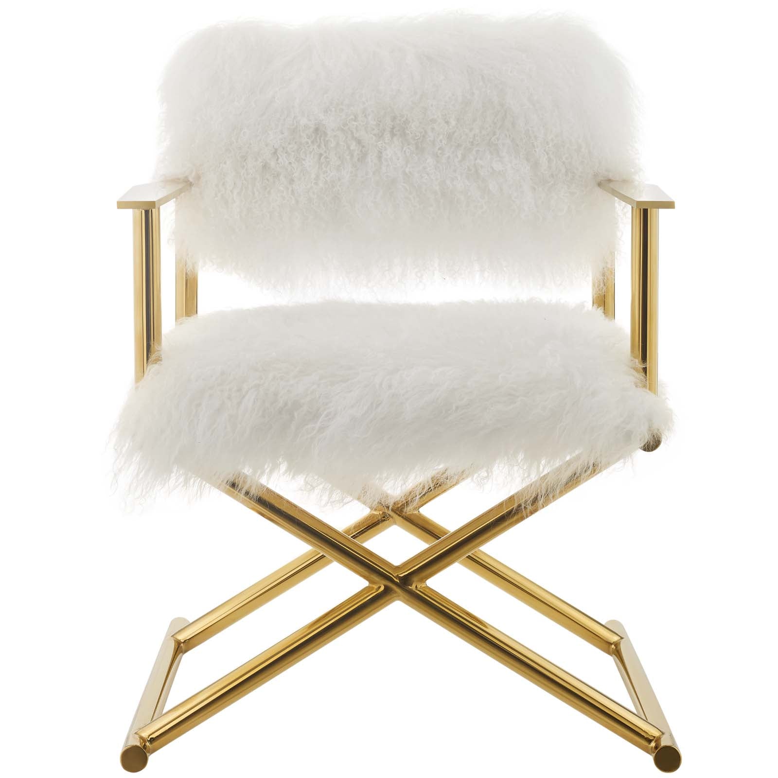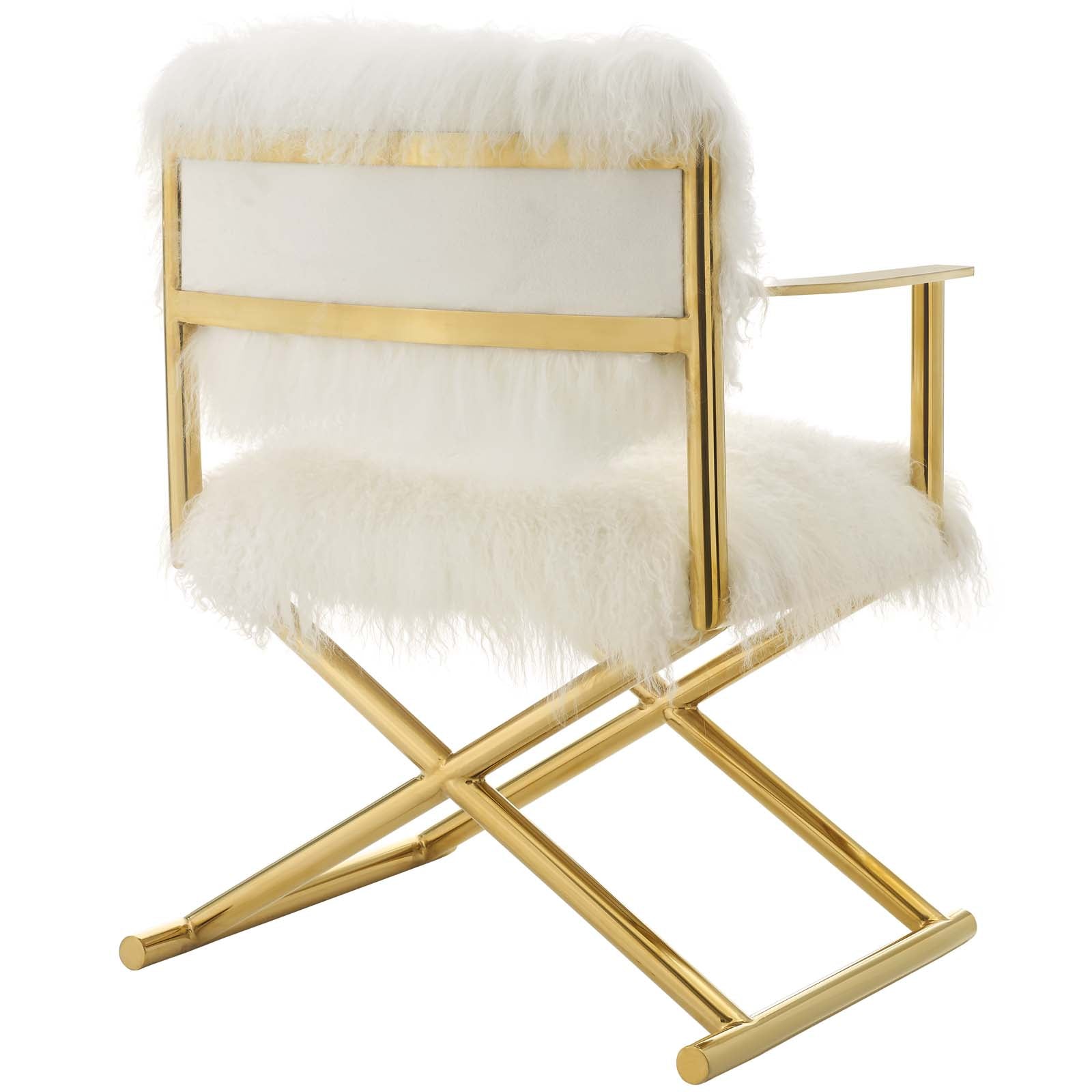 Let the cameras roll on the luxe glam look of the Action Director's Chair. Perfect as an accent chair in the bedroom, living room or vanity, Action is a chic update to the classic director's chair with its elegant fur detail, dense foam padding, and stylish look. This modern accent armchair comes upholstered in a luxurious, softly textured 4" long, pure white sheepskin fur seat and back, and is supported by a polished gold stainless steel frame with white plastic foot caps to protect your floors. Accentuate your modern décor with this upscale accent director's chair that elevates the look of any home or apartment. Comes Fully Assembled, Base Is Not Collapsible. Weight Capacity: 221 lbs. Set Includes: One - Action Pure White Cashmere Accent Director's Chair