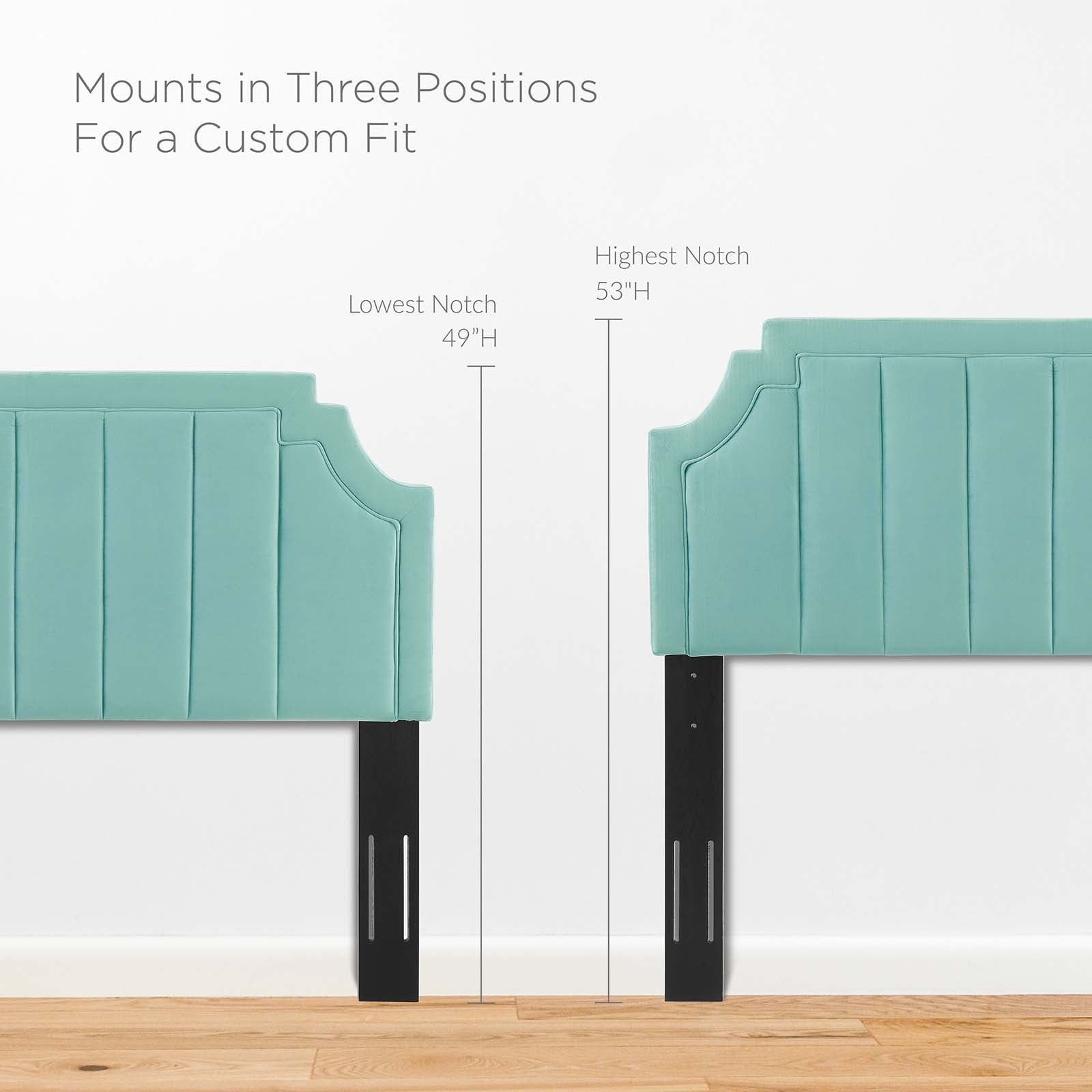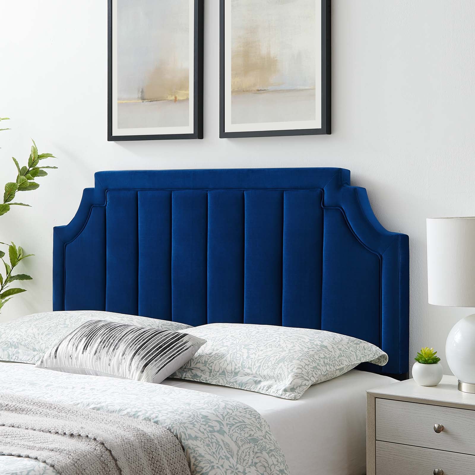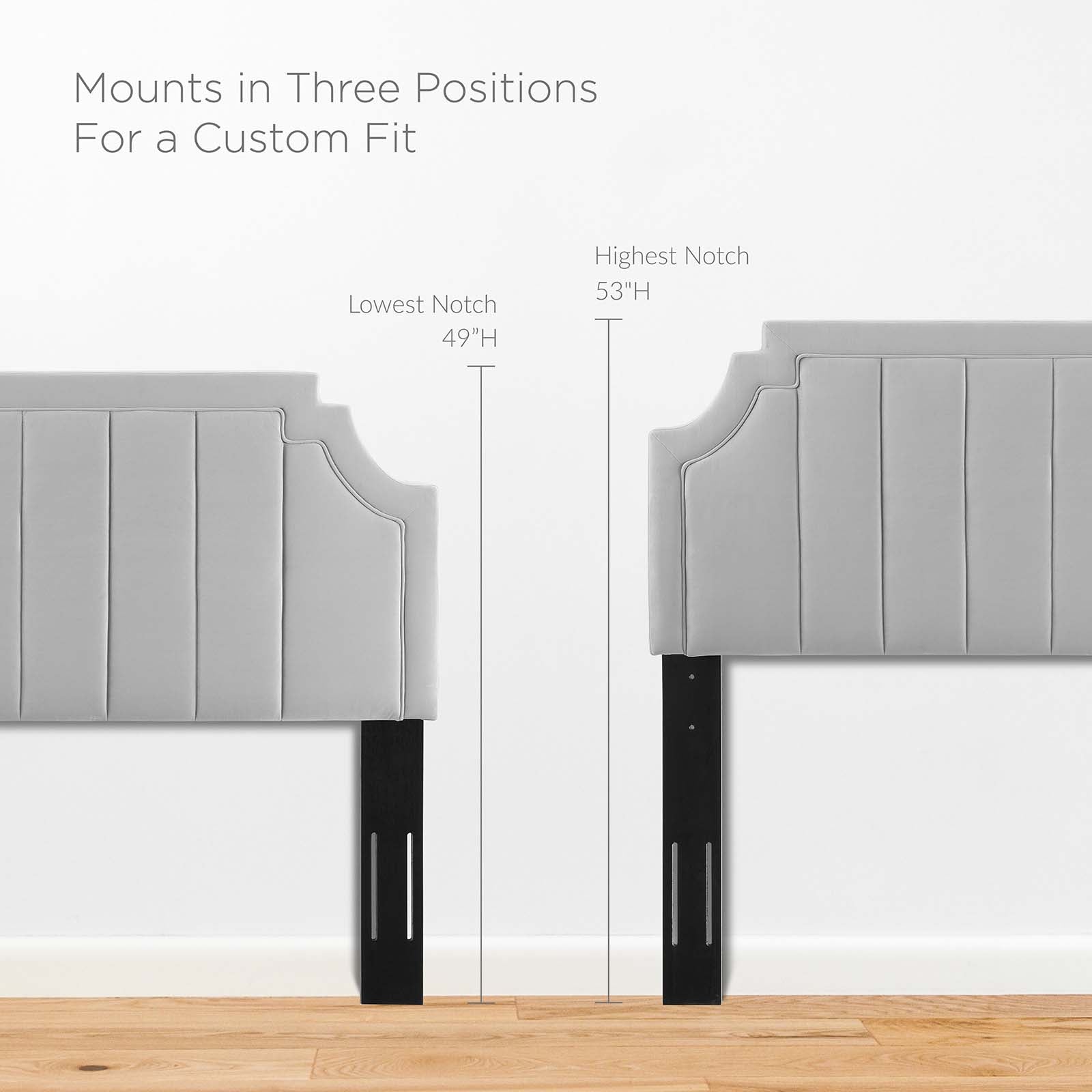 With vertical tufting, a unique silhouette, and luxurious texture, the Alyona Channel Tufted Performance Velvet King/California King Headboard brings glam deco style and vintage modern elegance to your master bedroom or guest bedroom. This king or Cali king size headboard features a beautiful shape, channel tufting, and subtle French piping. Upholstered in soft, stain-resistant performance velvet, this padded headboard offers supportive comfort while sitting up in bed resting or relaxing. A beautiful backdrop for a variety of bedding styles, this adjustable headboard fits king or California king beds with its three mounting positions. Assembly required. Set Includes: One - Alyona Channel Tufted King/California