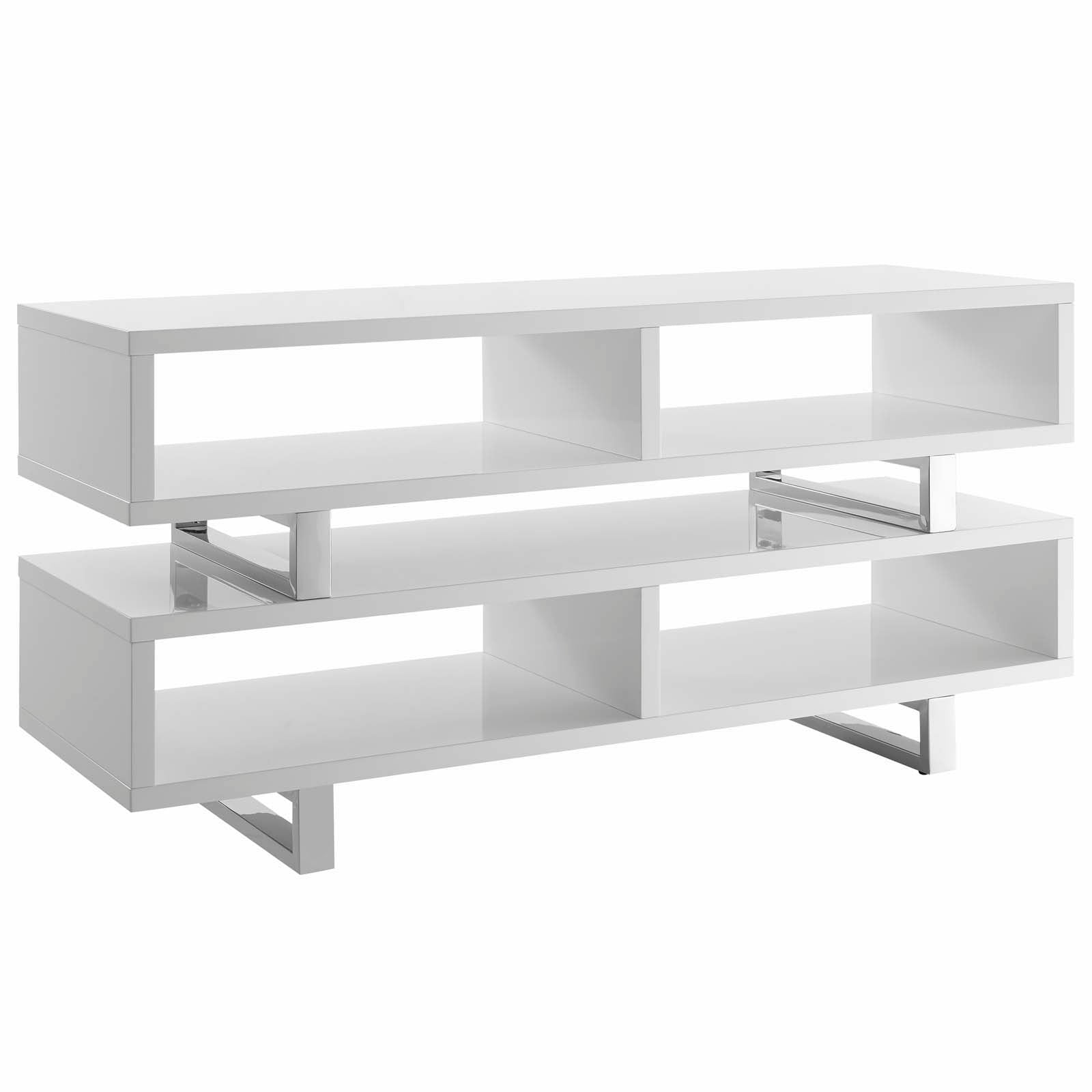 Chart out adventures with the Amble 47” TV Stand. Amble’s open design adds dimension while the smooth easy clean white melamine surface creates a sleek modern look. Made of durable fiberboard, Amble features polished stainless steel supports and protective pads. A balanced presence in your living, lounge, recreation or family room, display your television, books, and accent pieces with this standout contemporary modern TV stand and media console table. Set Includes: One - Amble 47” TV Stand