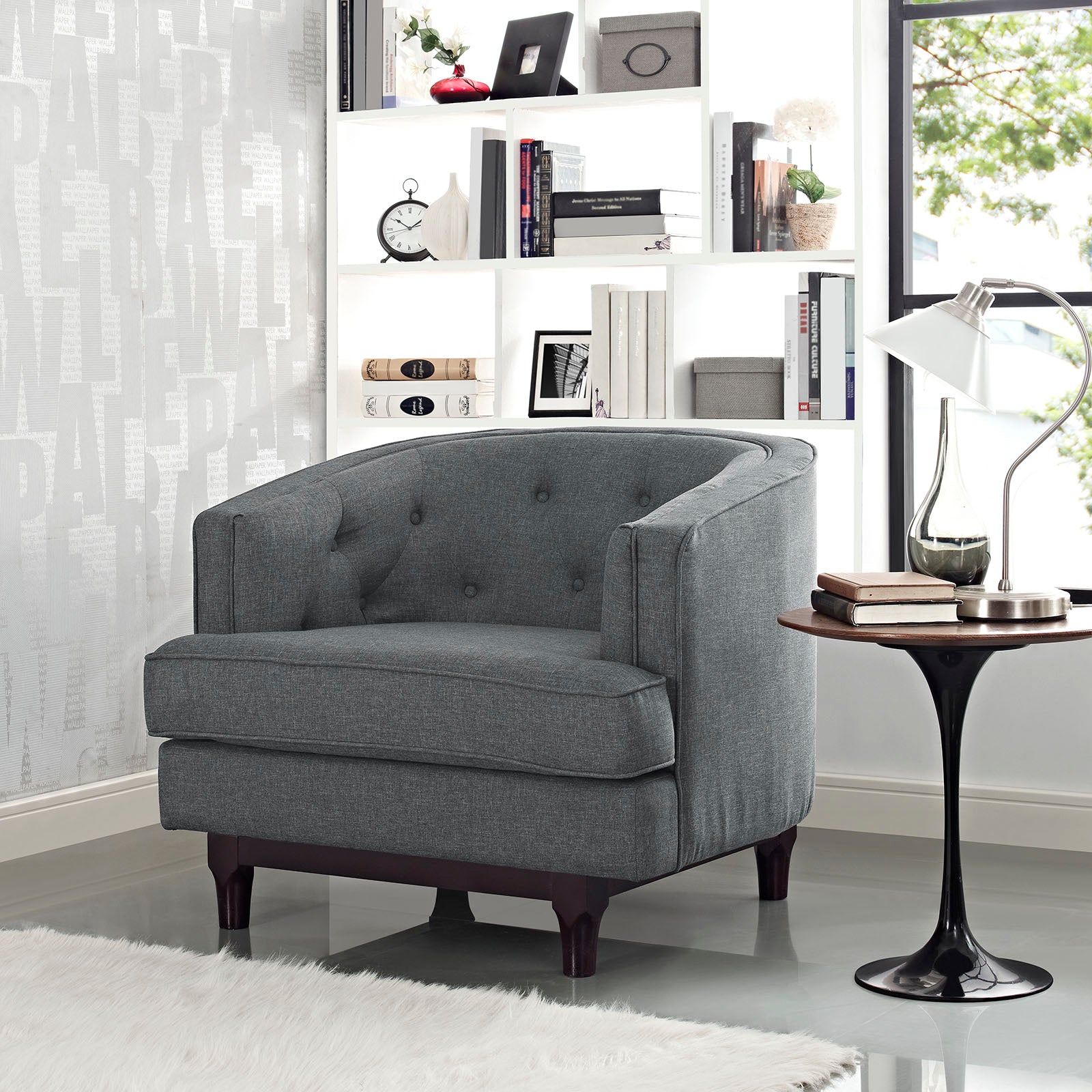 Sale the tide of elegance with Coast. Buoyed with exquisite deep button tufting and fine trim, Coast comes upholstered in polyester with a walnut stained wood leg base with non-marking foot glides. Solidly made with exceptional support, Coast features dense foam cushioning, removable seat covers for easy cleaning and generous seating space. Combining mid-century style with ageless nobility, the Coast armchair is perfect for modern and eclectic living rooms, lounge spaces, and reception areas. Set Includes: 1 - Coast Armchair