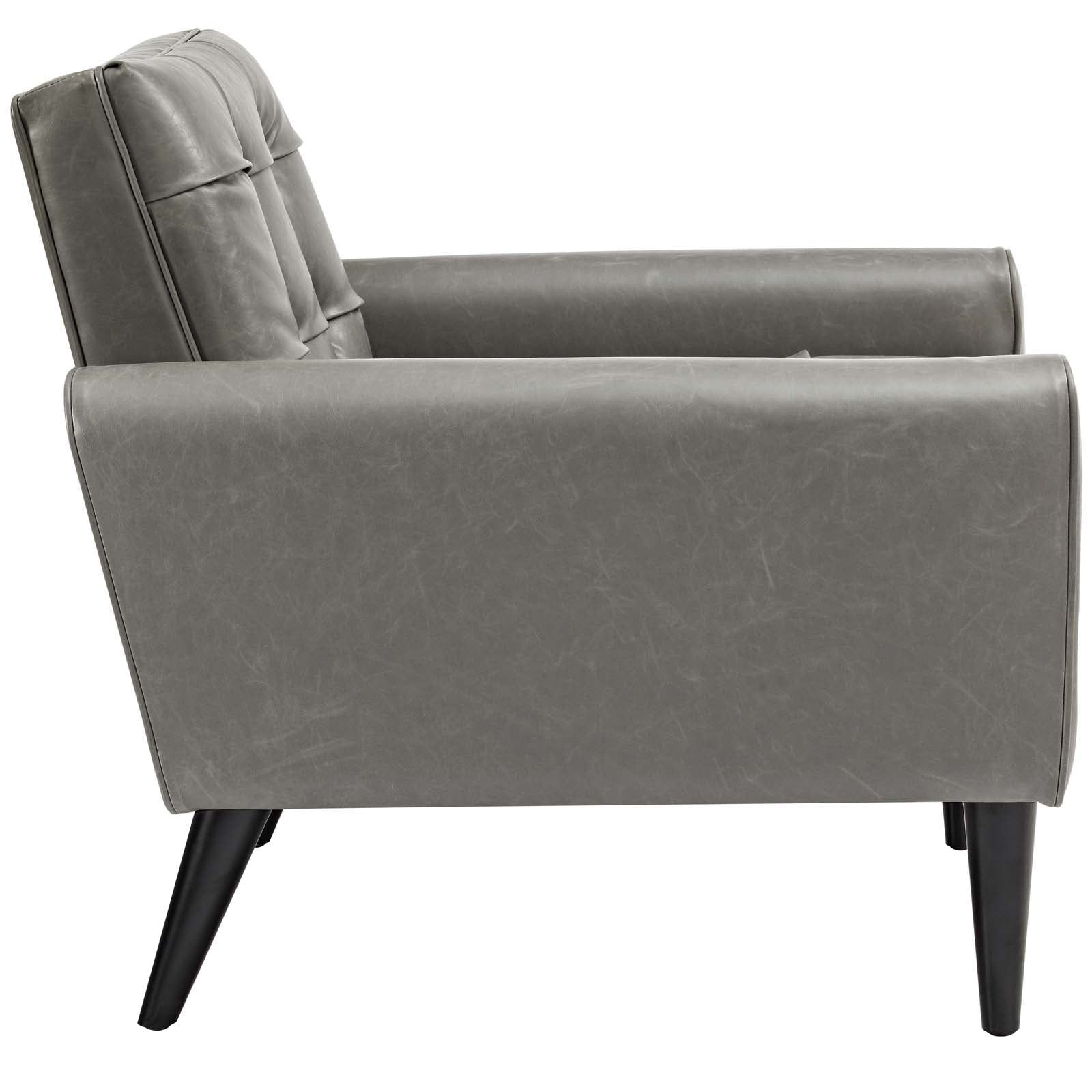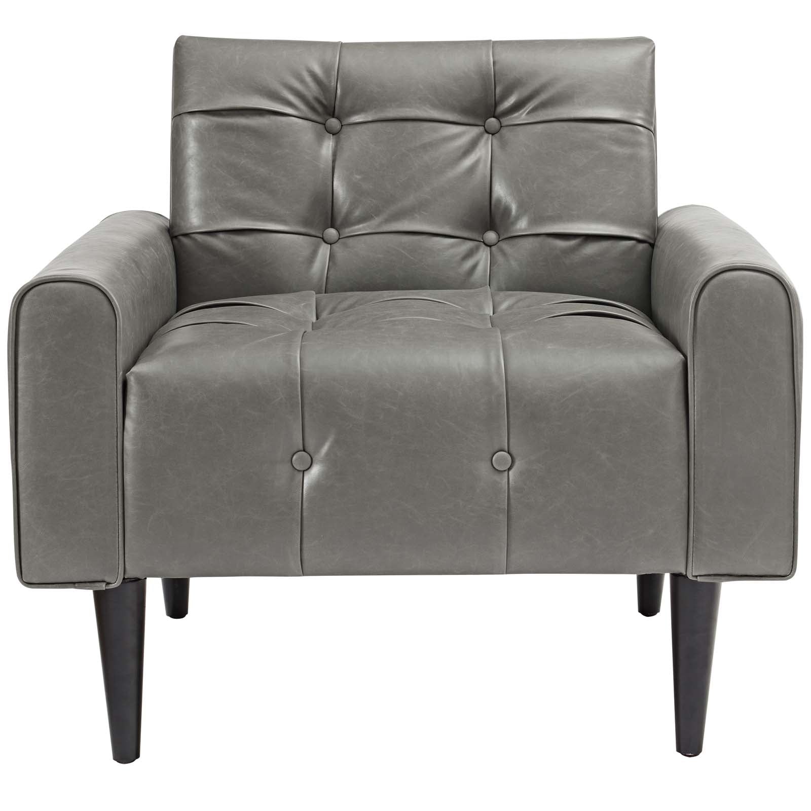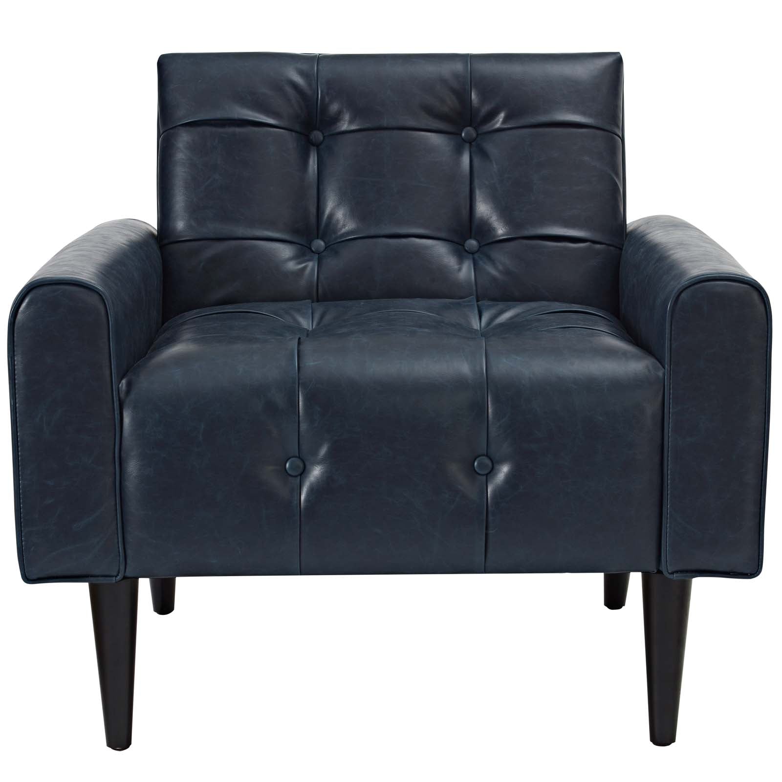 Transform your living room with the Delve Accent Chair. Luxuriously tufted buttons adorn the antique faux leather for an exquisite look of exceptional appeal. Featuring gently curved armrests and a fashionably chic shape, Delve comes densely padded in foam with solid wood legs. The perfect addition to the modern home or apartment, invigorate your home or apartment décor today with this exceptional piece. Matching sofa also available. Comes with non-marking foot glides. Set Includes: One - Delve Accent Chair