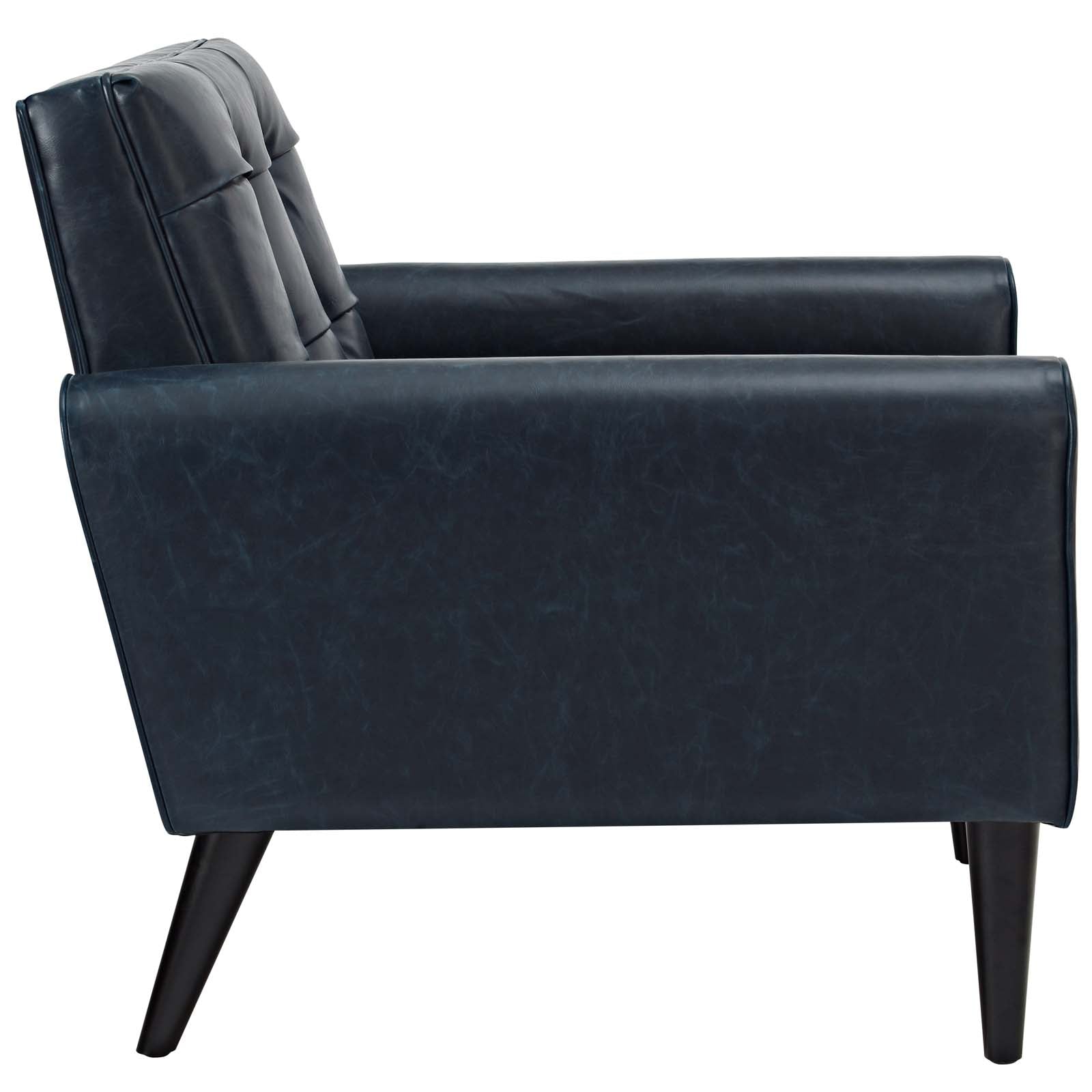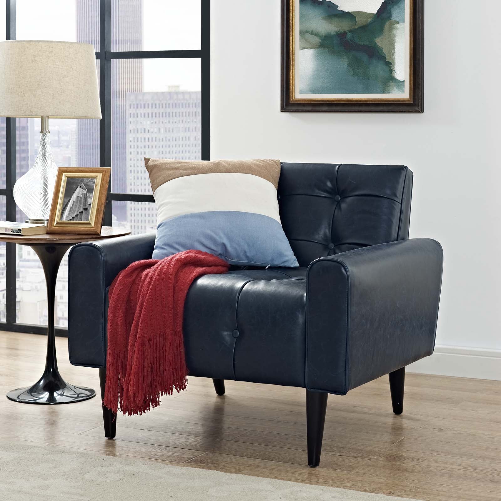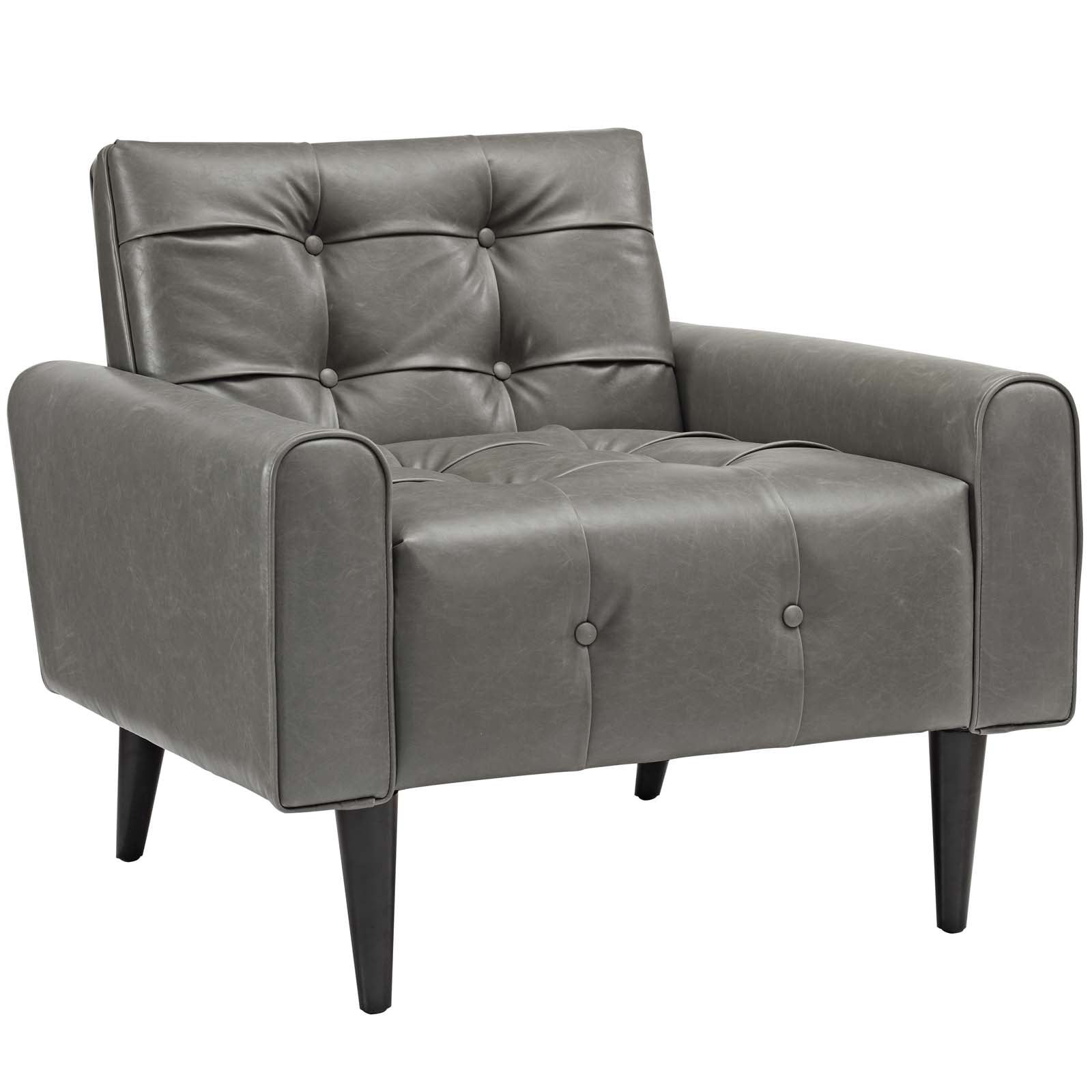 Transform your living room with the Delve Accent Chair. Luxuriously tufted buttons adorn the antique faux leather for an exquisite look of exceptional appeal. Featuring gently curved armrests and a fashionably chic shape, Delve comes densely padded in foam with solid wood legs. The perfect addition to the modern home or apartment, invigorate your home or apartment décor today with this exceptional piece. Matching sofa also available. Comes with non-marking foot glides. Set Includes: One - Delve Accent Chair