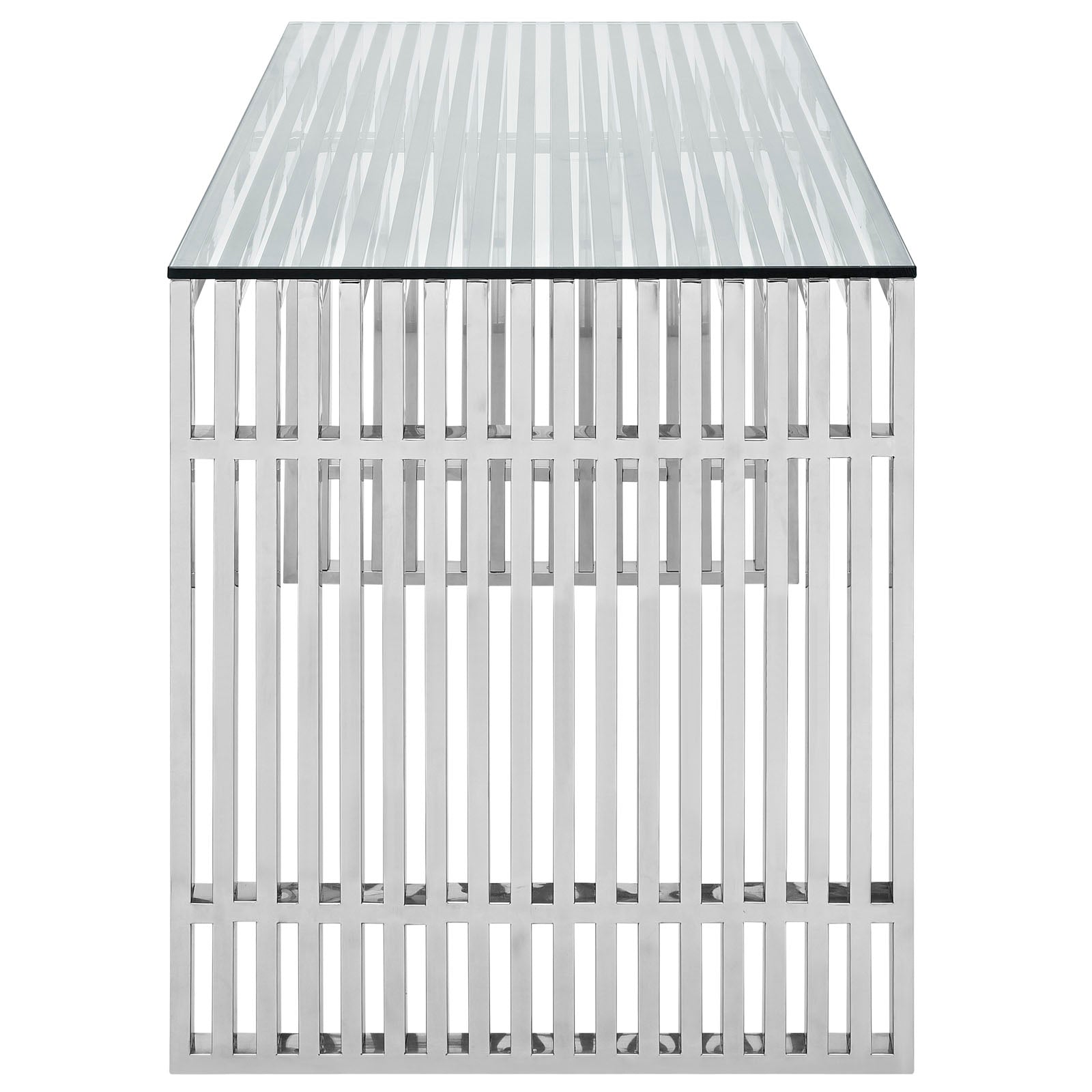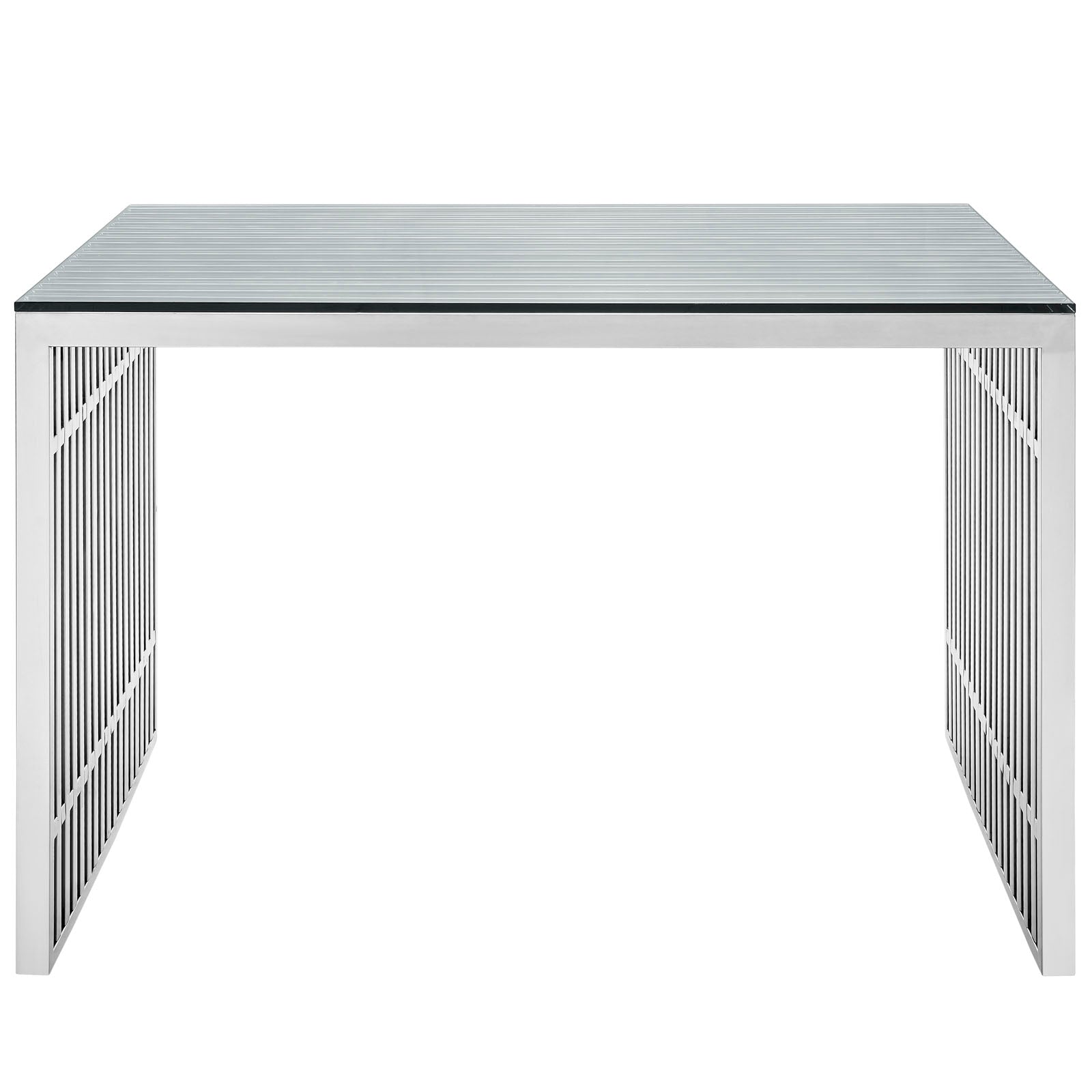 Straight lines were once deemed the realm of strict logic. This conduit design accomplishes something quite profound. It blends linear components with a pleasantly stainless steel tubular effect. Modernism used to be about extremes. Wild shapes and patterns that don’t dare resemble its predecessors. We’ve reached an age of maturity of sorts. We appreciate style, but all the more, we respect those designs that represent a blending of cultures. The Gridiron tubular stainless steel desk is famous not for its radical shape, but for the strategic transcendence that it provides work environments. The Gridiron desk is perfect for home or office workspaces in need of transformation. Set Includes: One - Gridiron Stainless Steel Desk