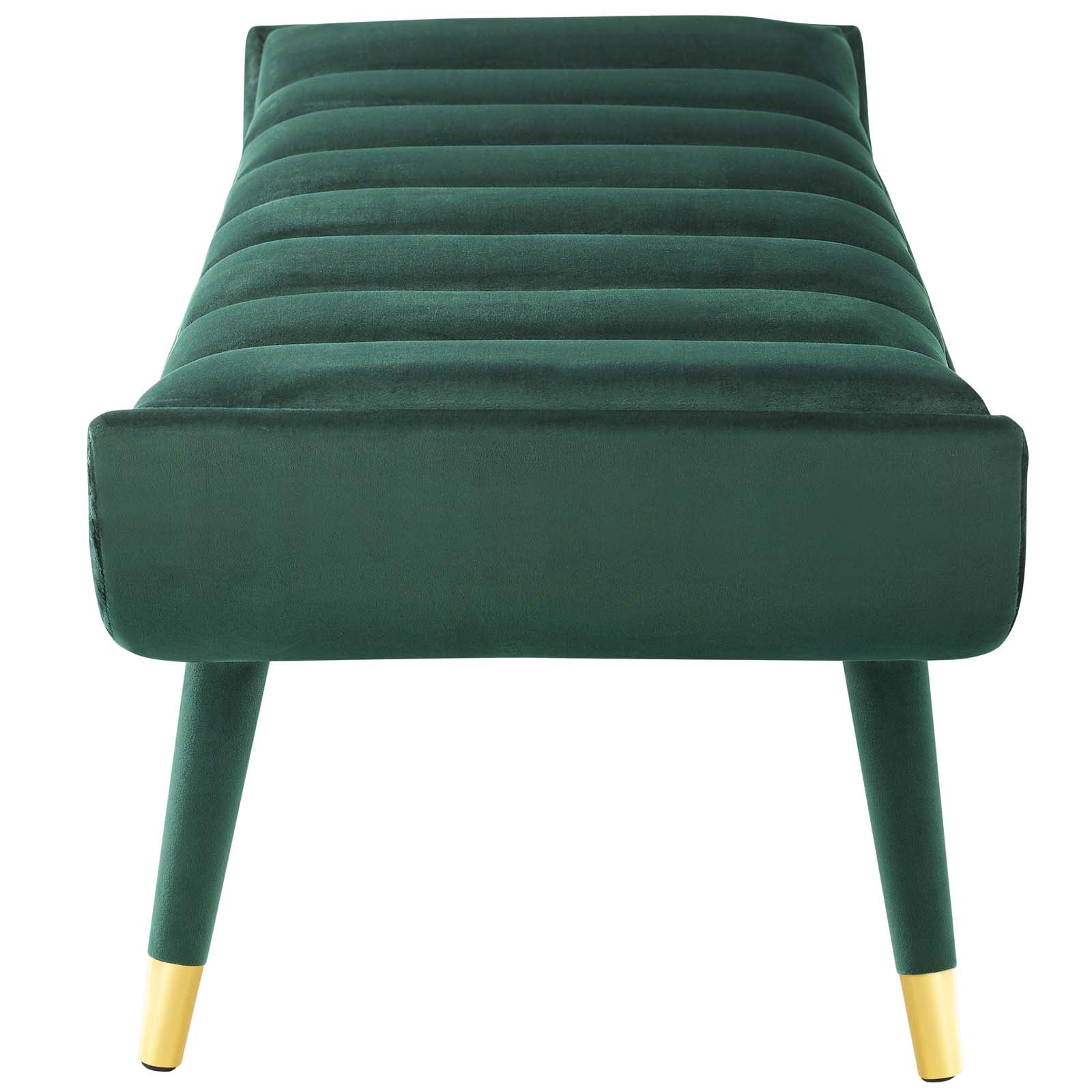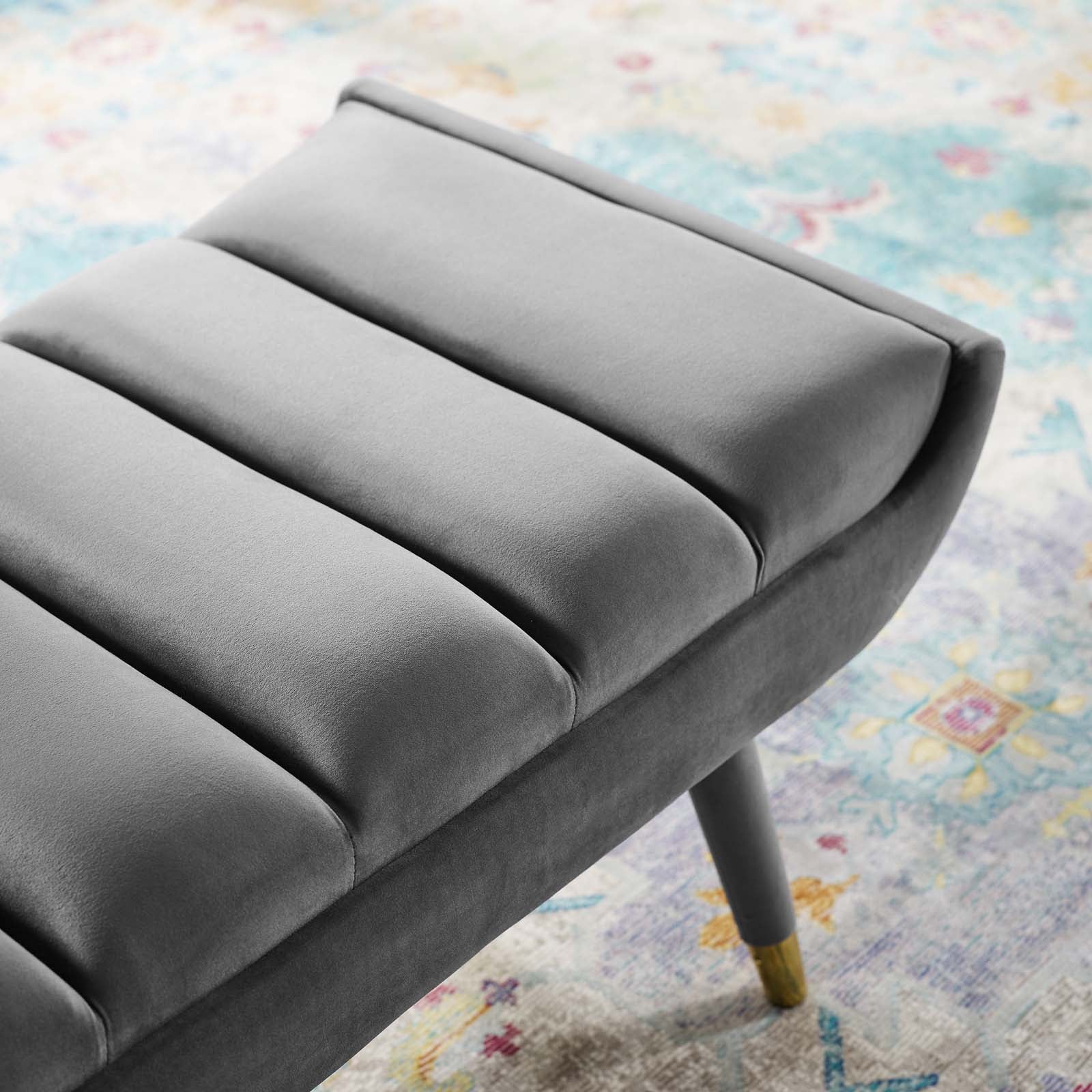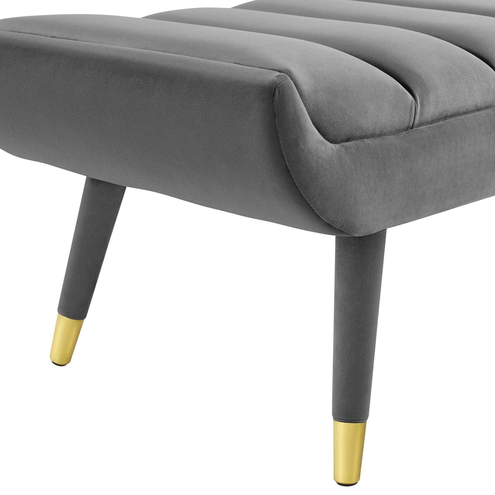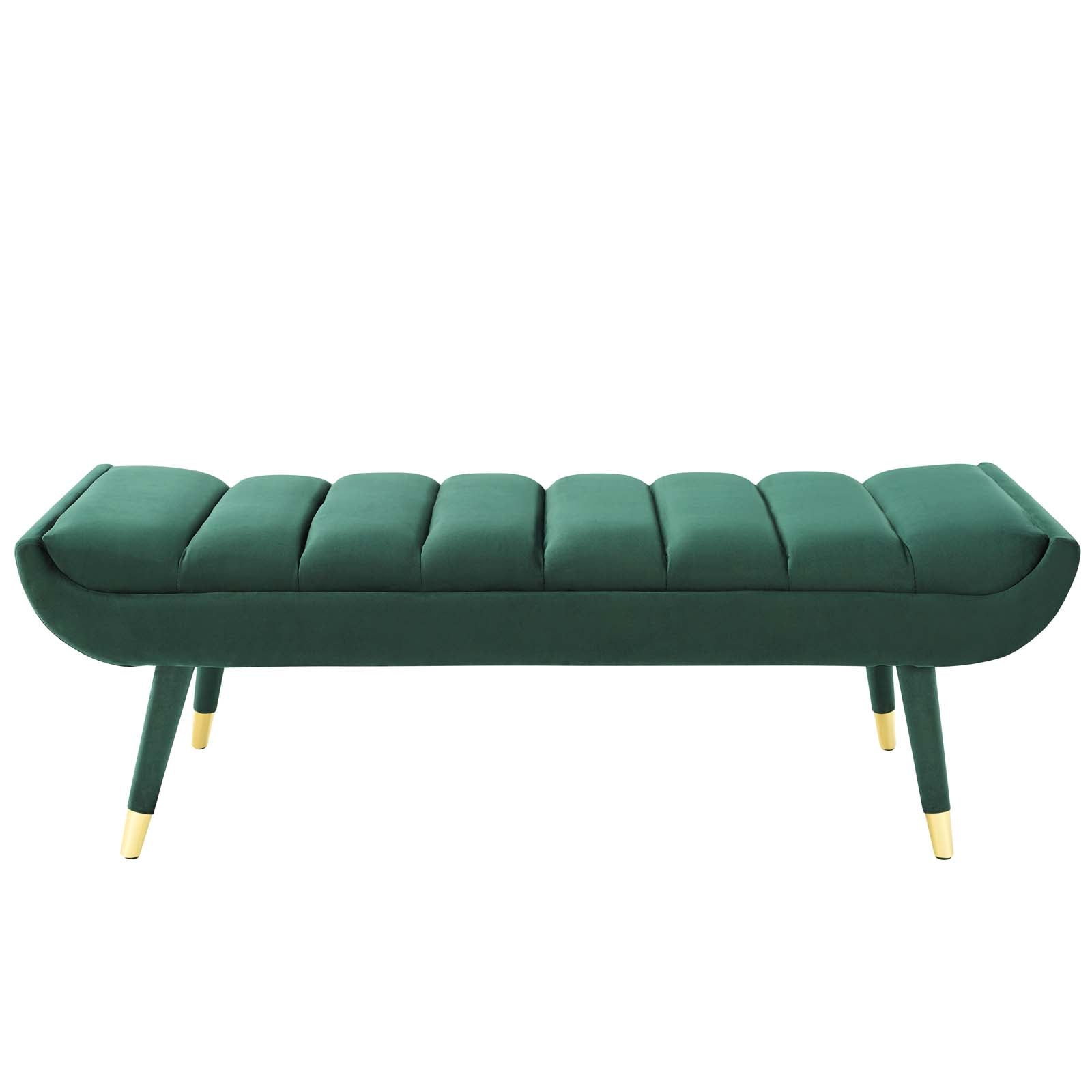 Subtle flair renews your living room decor with Guess. Channel tufting adds visual depth while Guess's gently curving ends add uplifting stability with vintage artisan accents. Guess is the transformative accent bench that will update your foyer, entryway, bedroom, living room, home office, or lounge area with sophistication and chic style. Soft, stain-resistant performance velvet upholstery covers the dense foam padding for added seating luxury. Guess is comprised of a solidly constructed rubberwood frame resting on four tapered birch legs covered in matching velvet upholstery with gold metal foot sleeves for that perfect artisan touch. Accent bench weight capacity: 600 lbs. Set Includes: One - Guess Channel Tufted Accent Bench