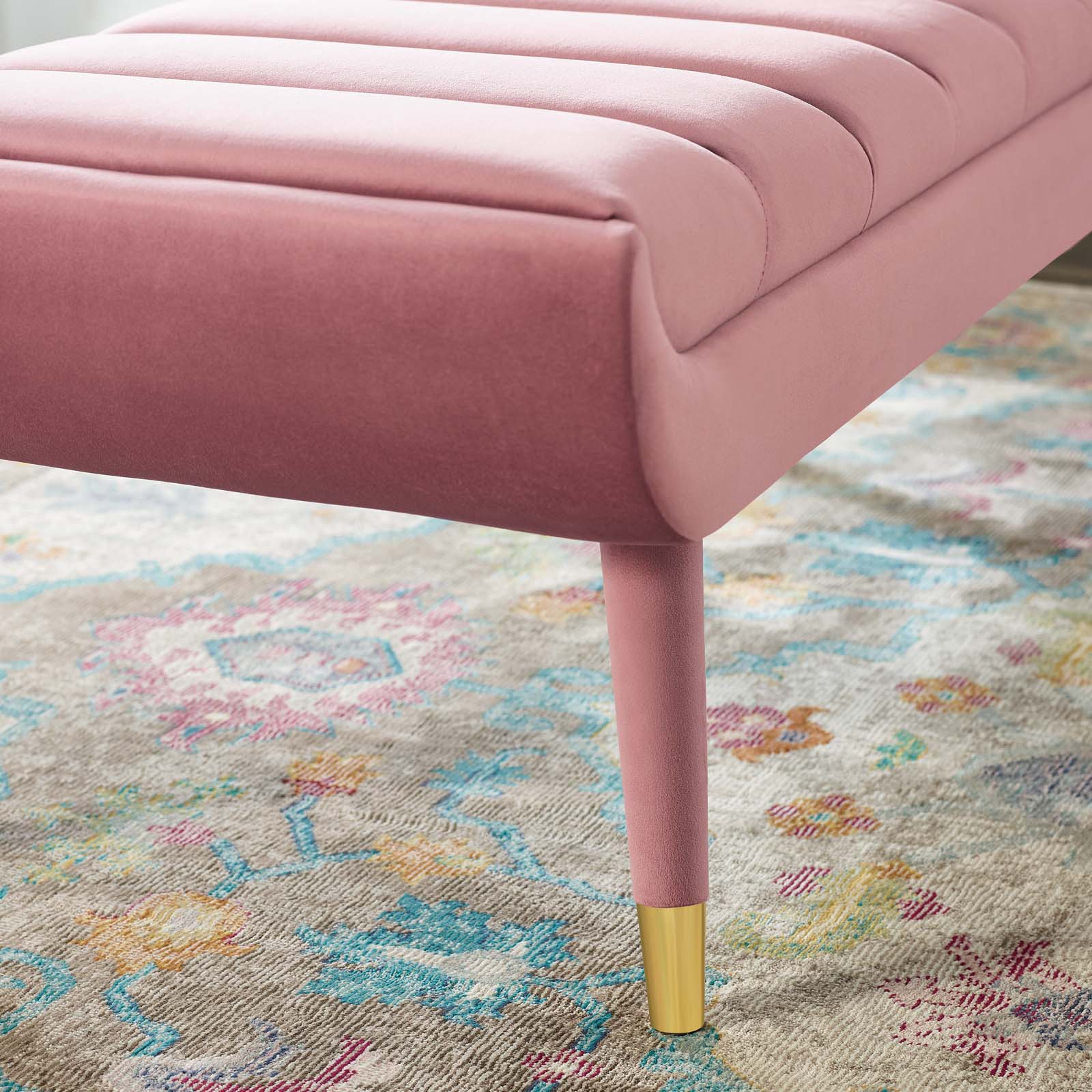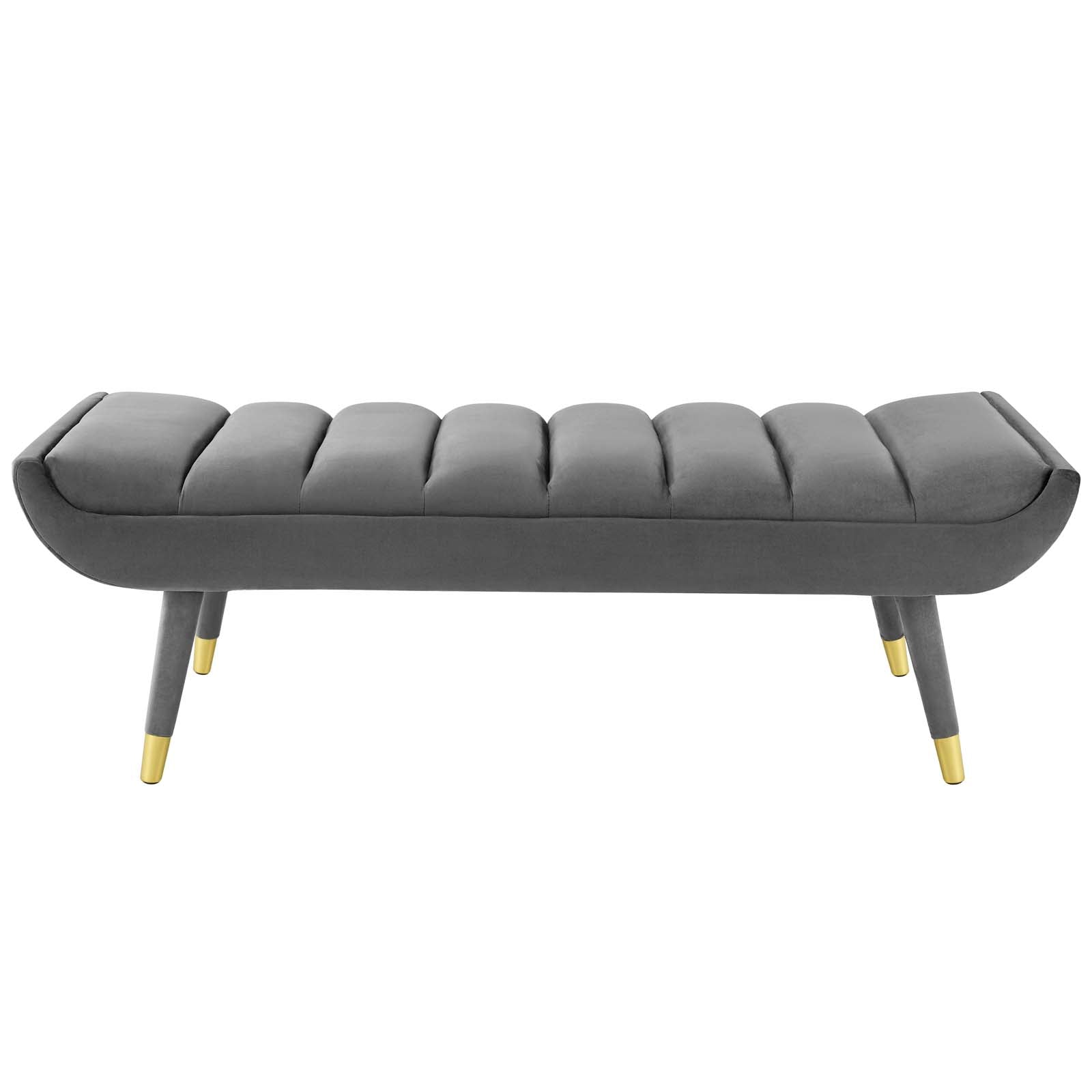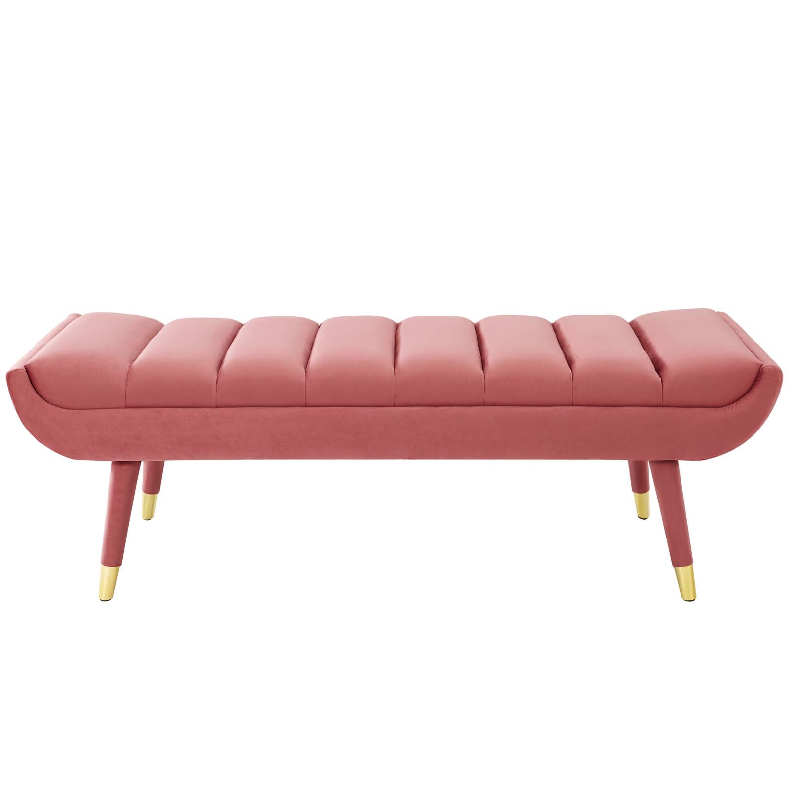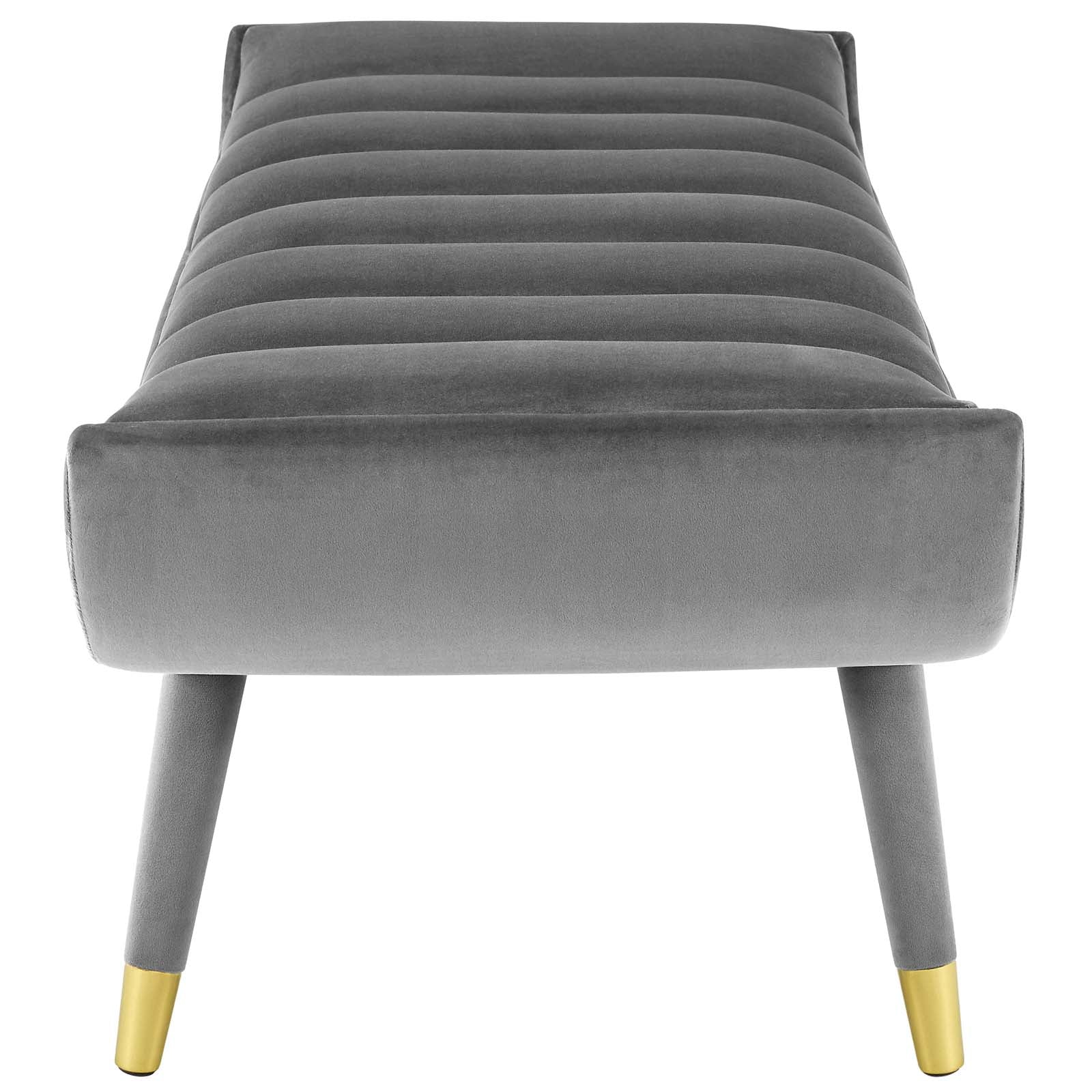 Subtle flair renews your living room decor with Guess. Channel tufting adds visual depth while Guess's gently curving ends add uplifting stability with vintage artisan accents. Guess is the transformative accent bench that will update your foyer, entryway, bedroom, living room, home office, or lounge area with sophistication and chic style. Soft, stain-resistant performance velvet upholstery covers the dense foam padding for added seating luxury. Guess is comprised of a solidly constructed rubberwood frame resting on four tapered birch legs covered in matching velvet upholstery with gold metal foot sleeves for that perfect artisan touch. Accent bench weight capacity: 600 lbs. Set Includes: One - Guess Channel Tufted Accent Bench