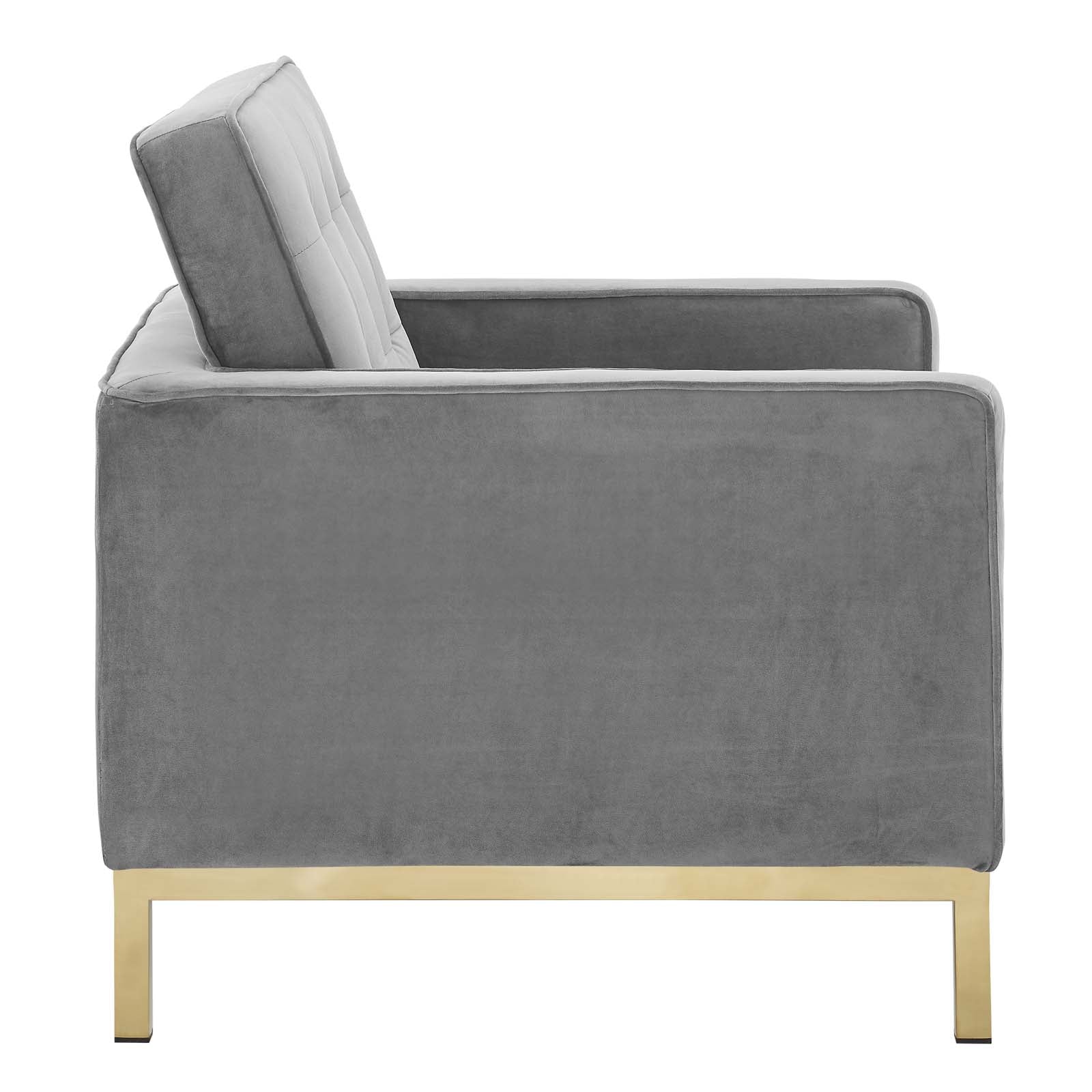 Revolutionize your living room furniture with the iconic Loft Button Tufted Performance Velvet Accent Lounge Armchair. Adding visual depth to your living room or lounge space, Loft features soft and durable performance velvet upholstery accented in elegant button tufting. This retro modern living room chair comes in a captivating linear design with an external tubular stainless steel frame, four gold stainless steel legs, and non-marking foot caps. Inspired by the richness of mid-century modern style, Loft is the preferred choice of living rooms and lounge spaces. Chair Weight Capacity: 300 lbs. Set Includes: One - Loft Gold Stainless Steel Armchair