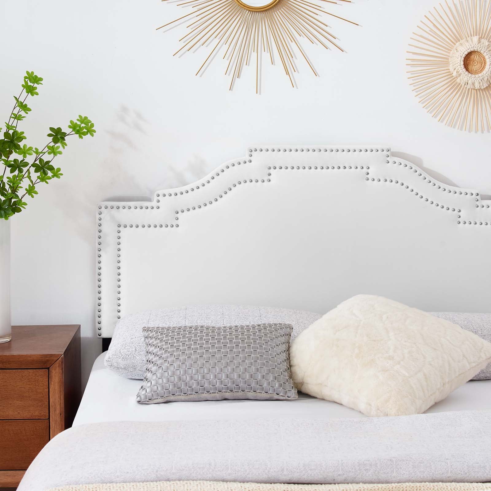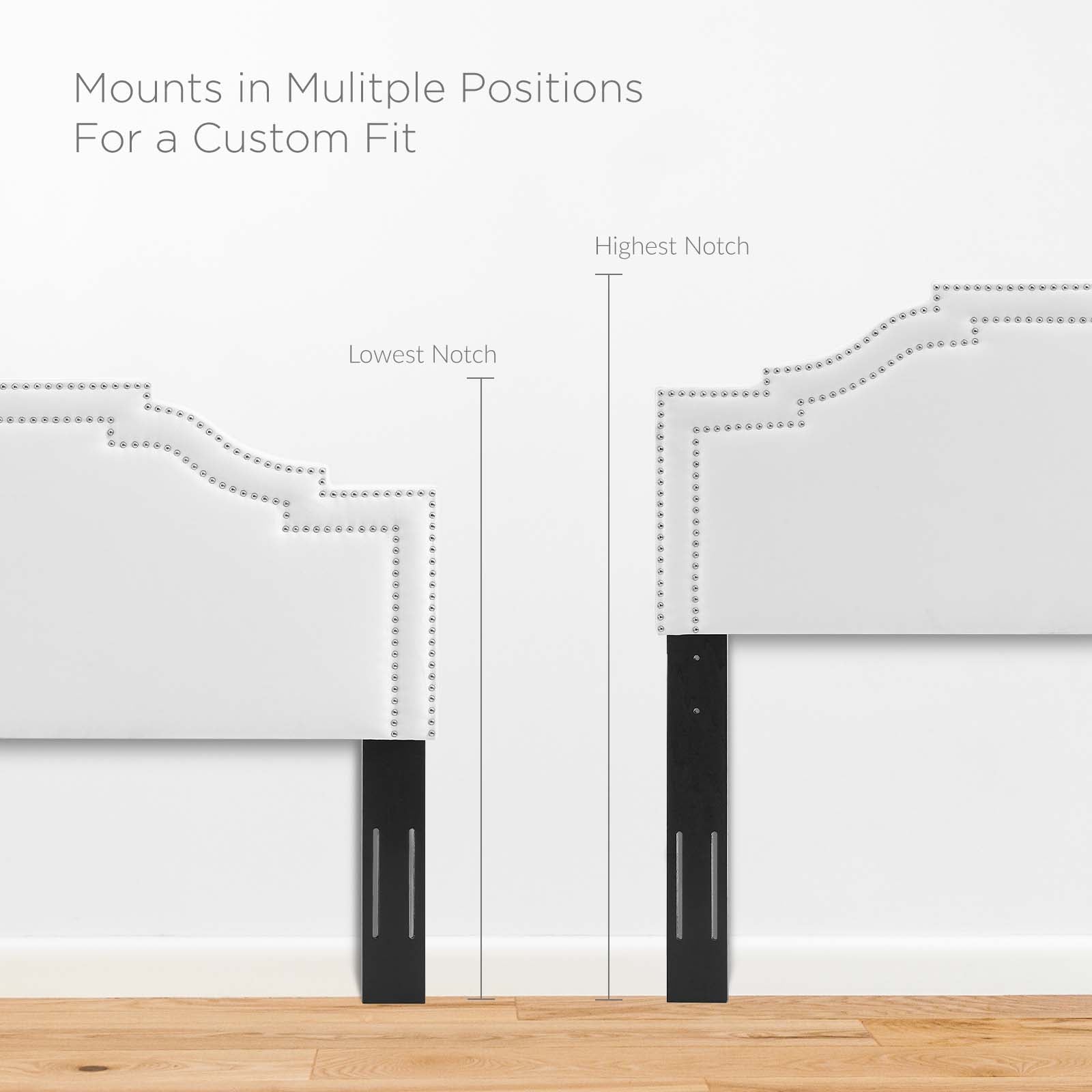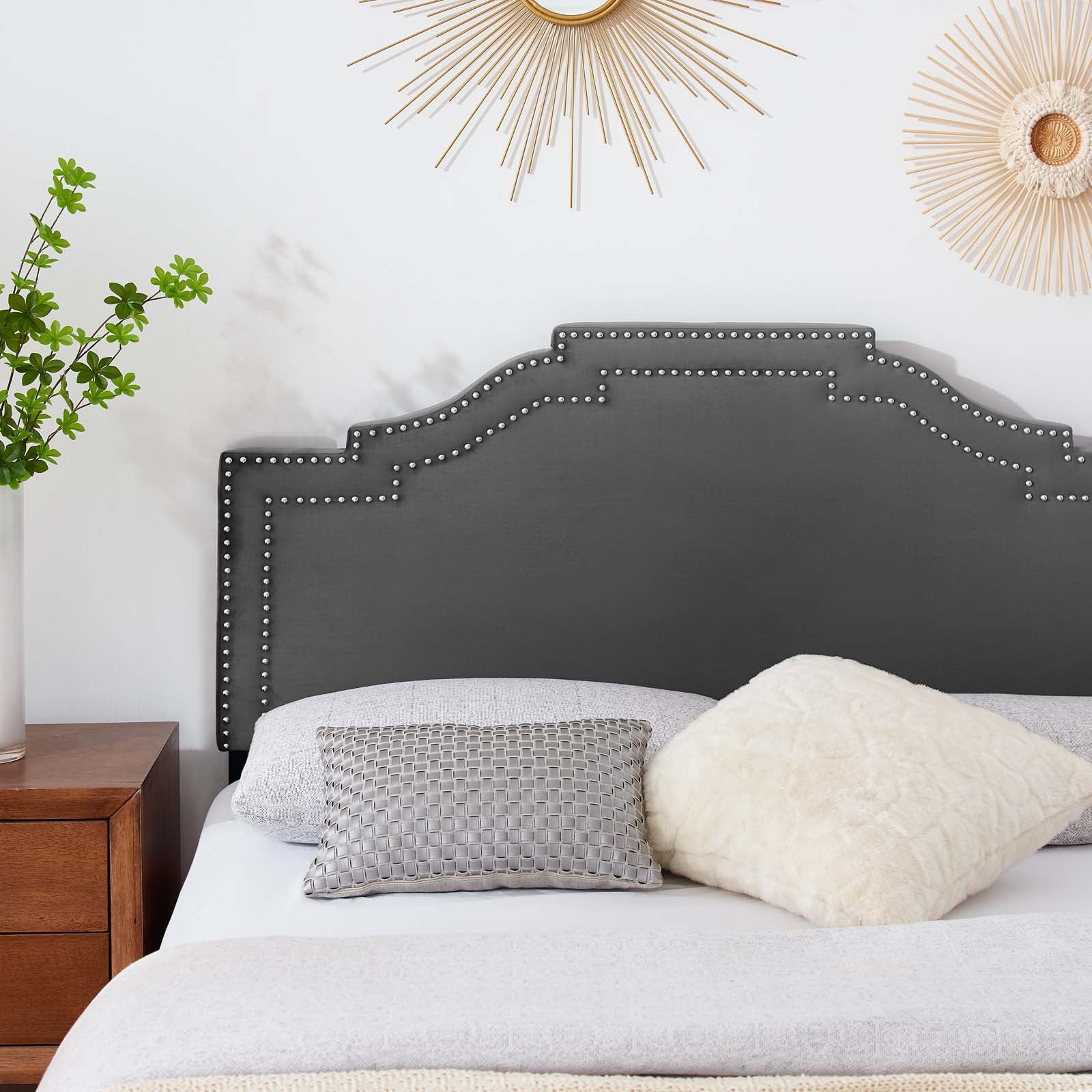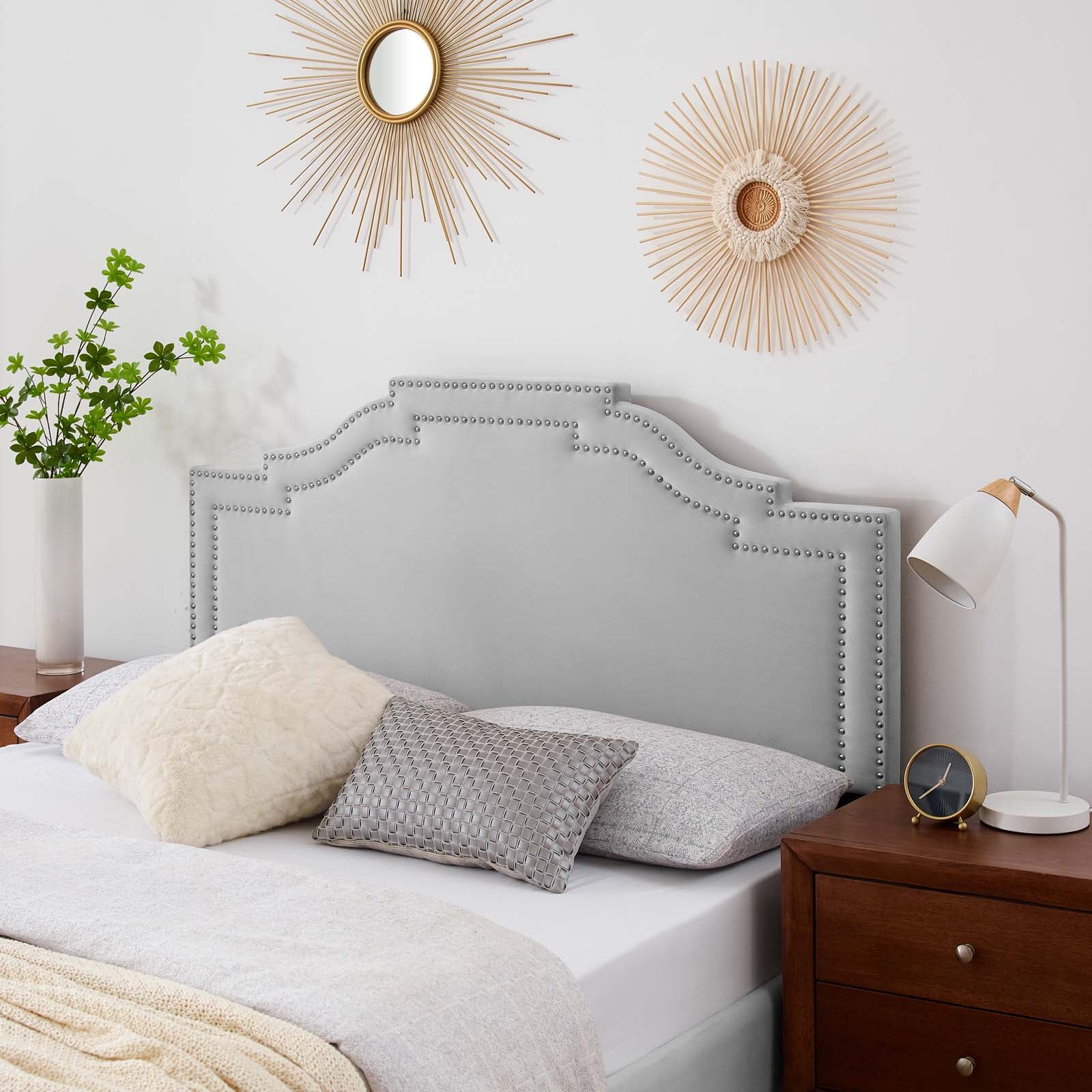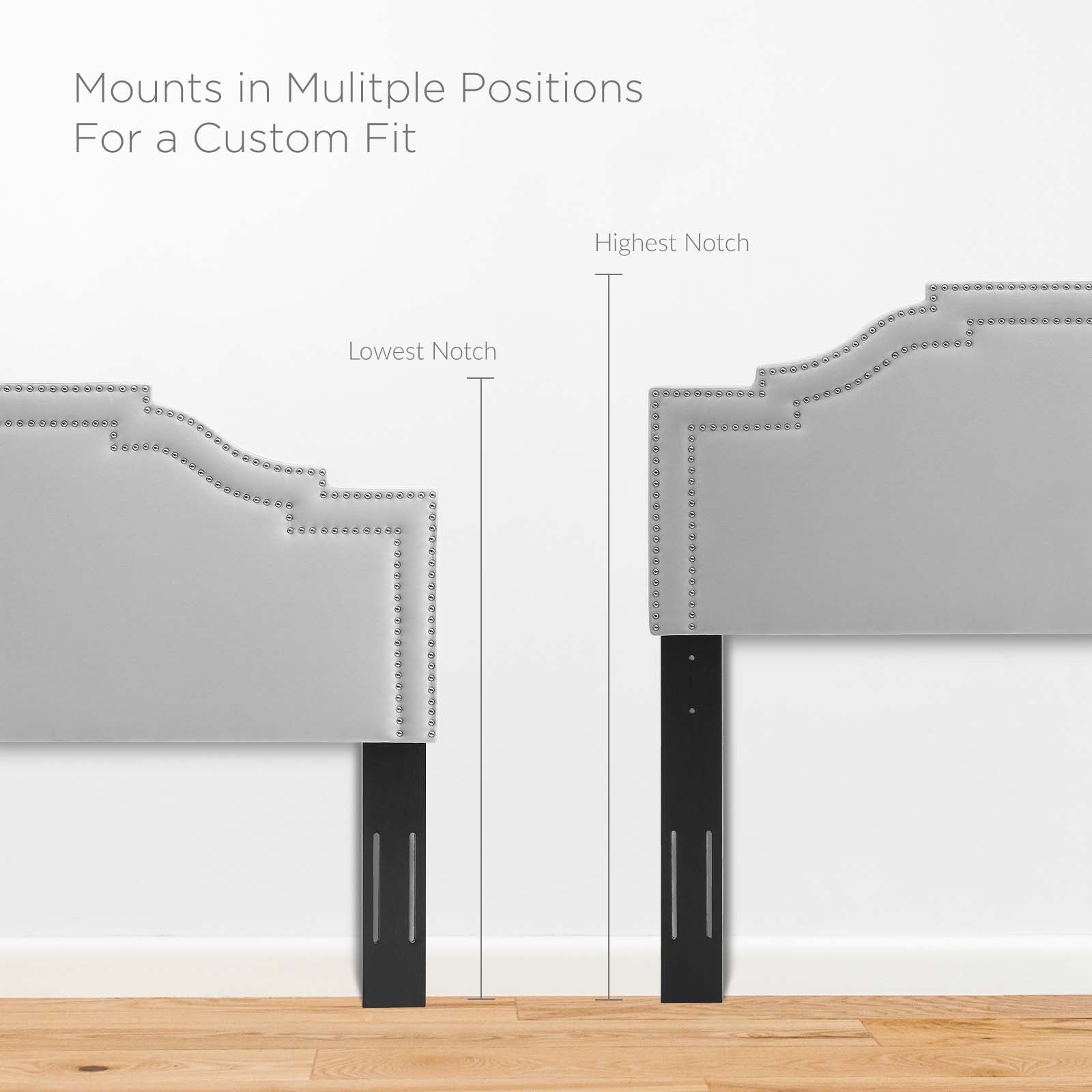 Influence glam deco style in a master bedroom or guest suite with the Lucia Performance Velvet Full/Queen Headboard. Featuring a double trim of nailheads and a unique arched shape, this velvet headboard brings tactile luxury to the bedroom. Covered in soft, stain-resistant performance velvet, this full/queen size headboard is padded in dense foam offering a supportive place to rest while sitting up in bed. A backdrop for a variety of bedding and sham styles, this height-adjustable headboard fits full or queen size bed frames with its three mounting positions. Assembly required. Set Includes: One - Lucia Full/Queen Headboard