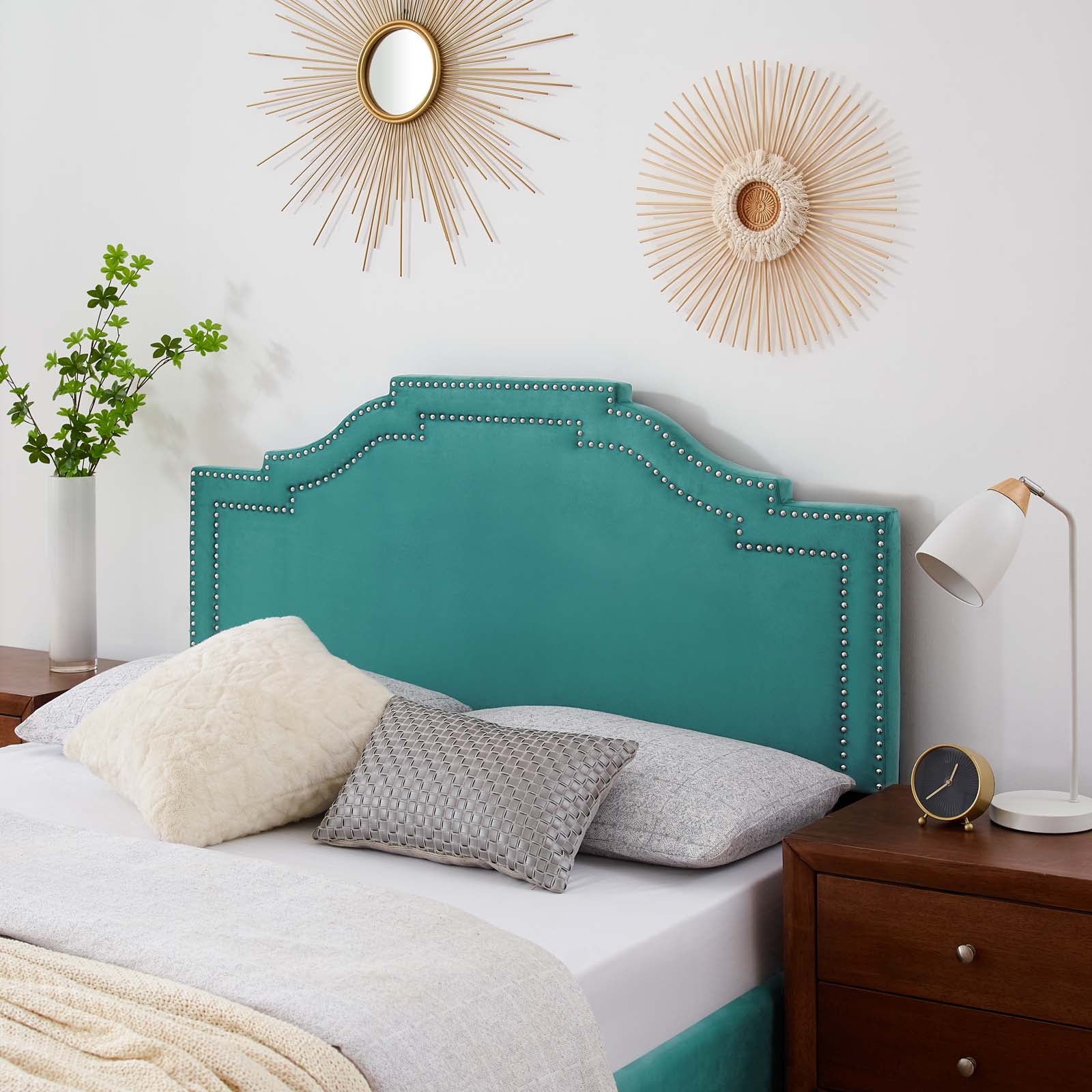 Influence glam deco style in a master bedroom or guest suite with the Lucia Performance Velvet King/California King Headboard. Featuring a double trim of nailheads and a unique arched shape, this velvet headboard brings tactile luxury to the bedroom. Covered in soft, stain-resistant performance velvet, this king/Cali king size headboard is padded in dense foam offering a supportive place to rest while sitting up in bed. A backdrop for a variety of bedding and sham styles, this height-adjustable headboard fits king or California king size bed frames with its three mounting positions. Assembly required. Set Includes: One - Lucia King/California King Headboard