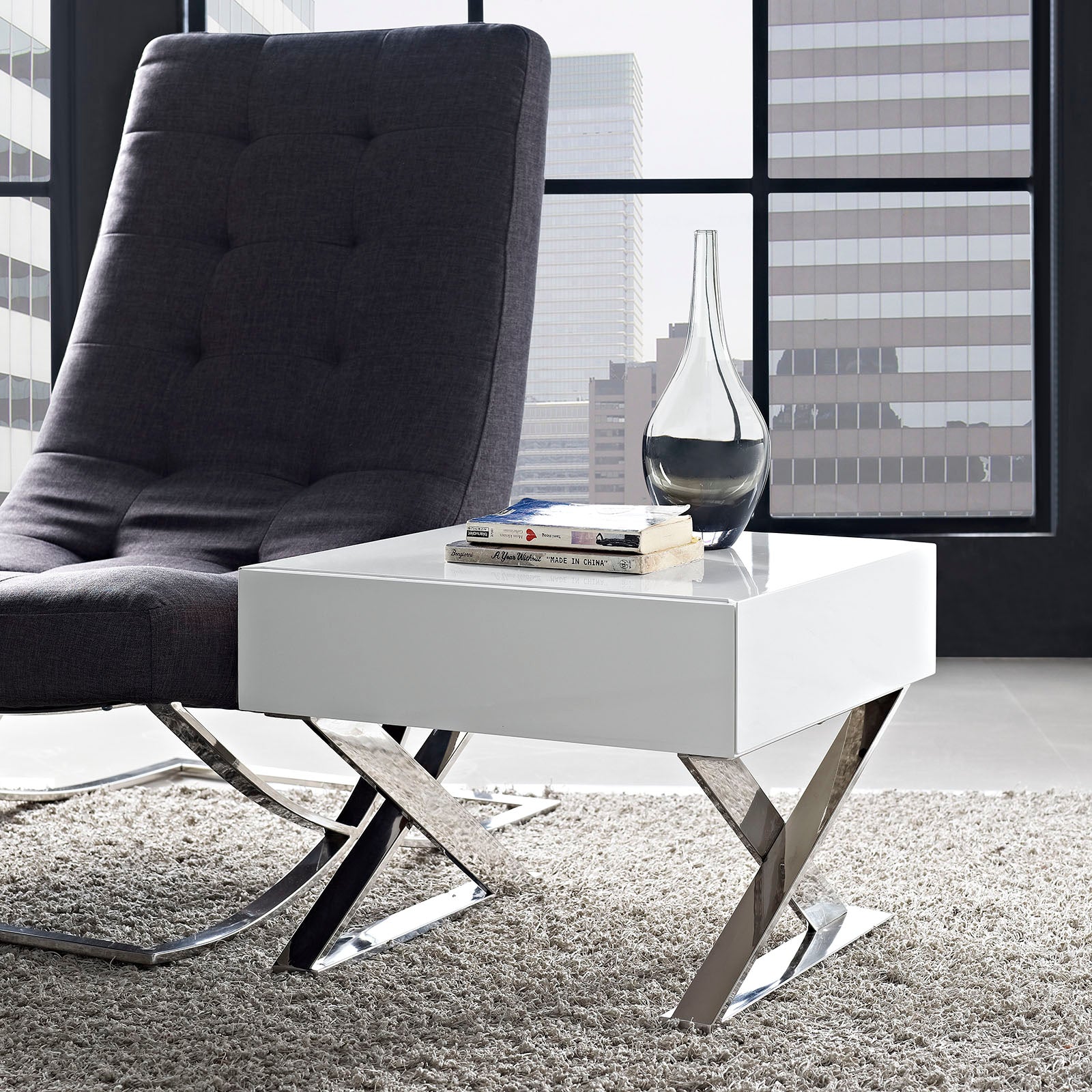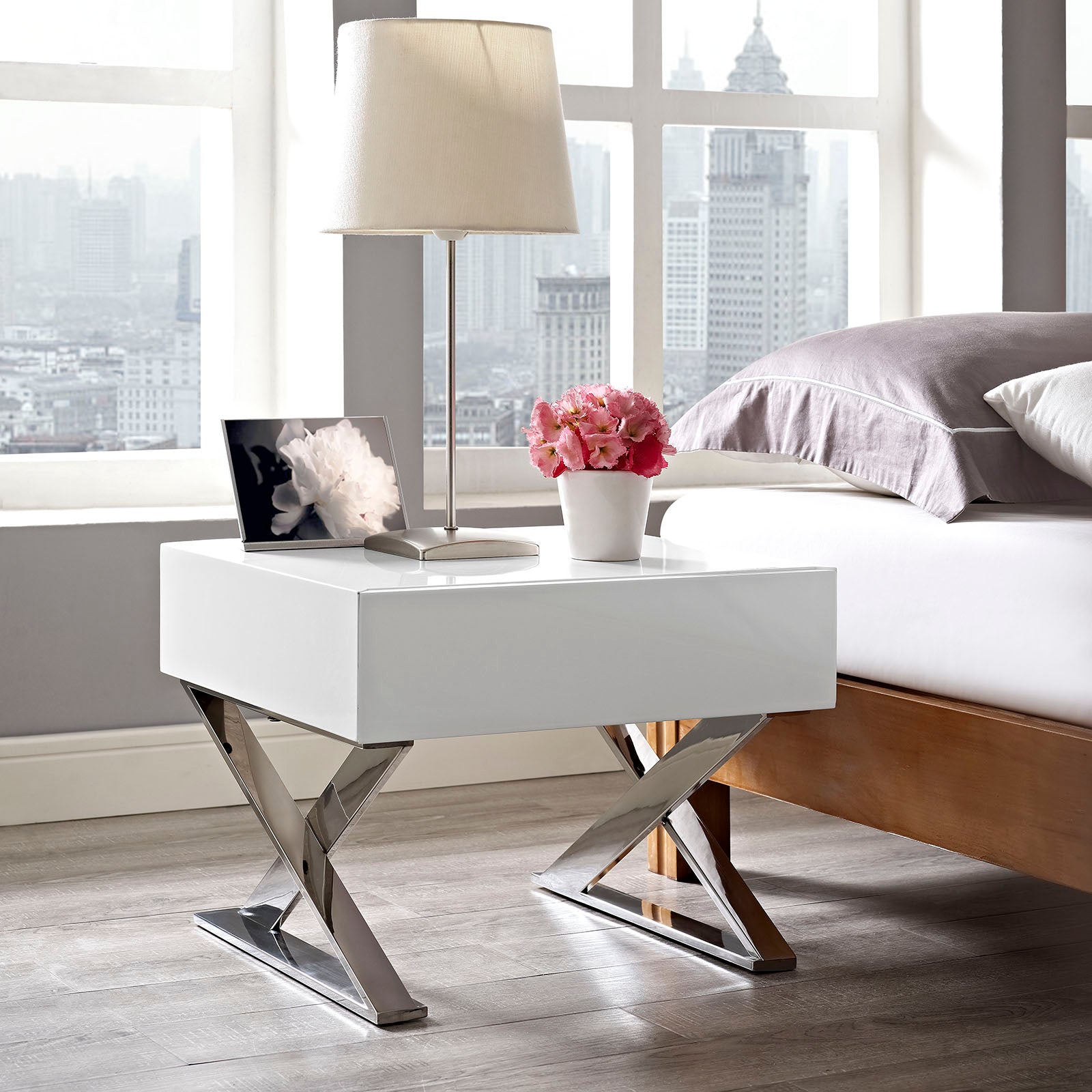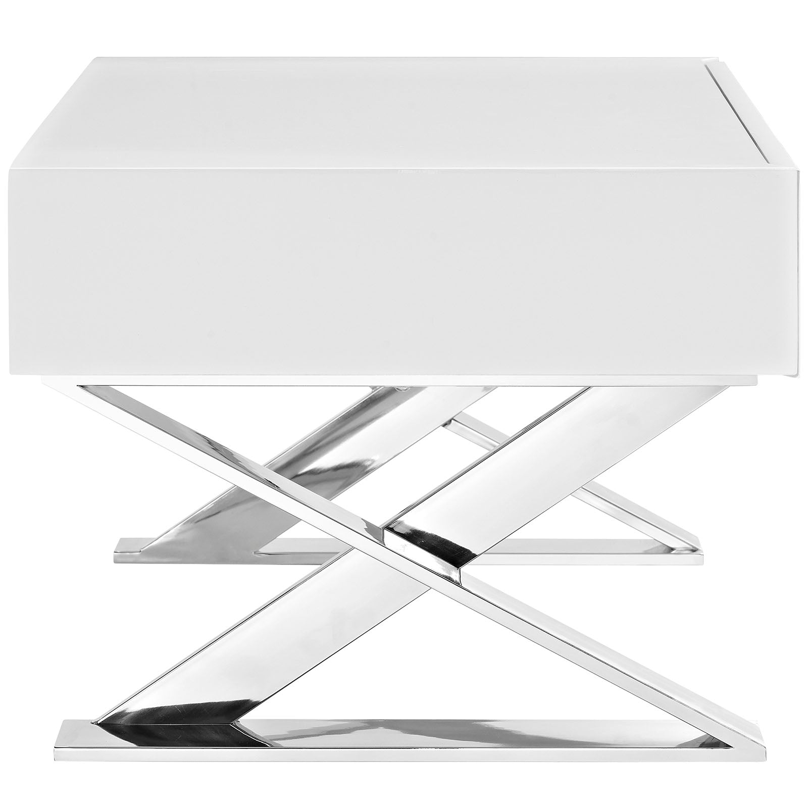 Create a space of distinction with the Sector Chrome Stainless Steel X Frame Nightstand End Table. Designed to impart a message of steady resolve, Sector Nightstand Table features a boxy high gloss veneer top with a smoothly gliding full drawer extension with metal drawer glides. This bedside table comes with a sleek polished chrome stainless steel x-frame base and non-marking foot pads to protect flooring integrity. Perfect as a bedside display table for your reading material, journal, table lamp, and other pre-sleep items, Sector Nightstand is an eye-catching retro modern addition that will enhance your contemporary home or apartment. Set Includes: One - Sector Nightstand