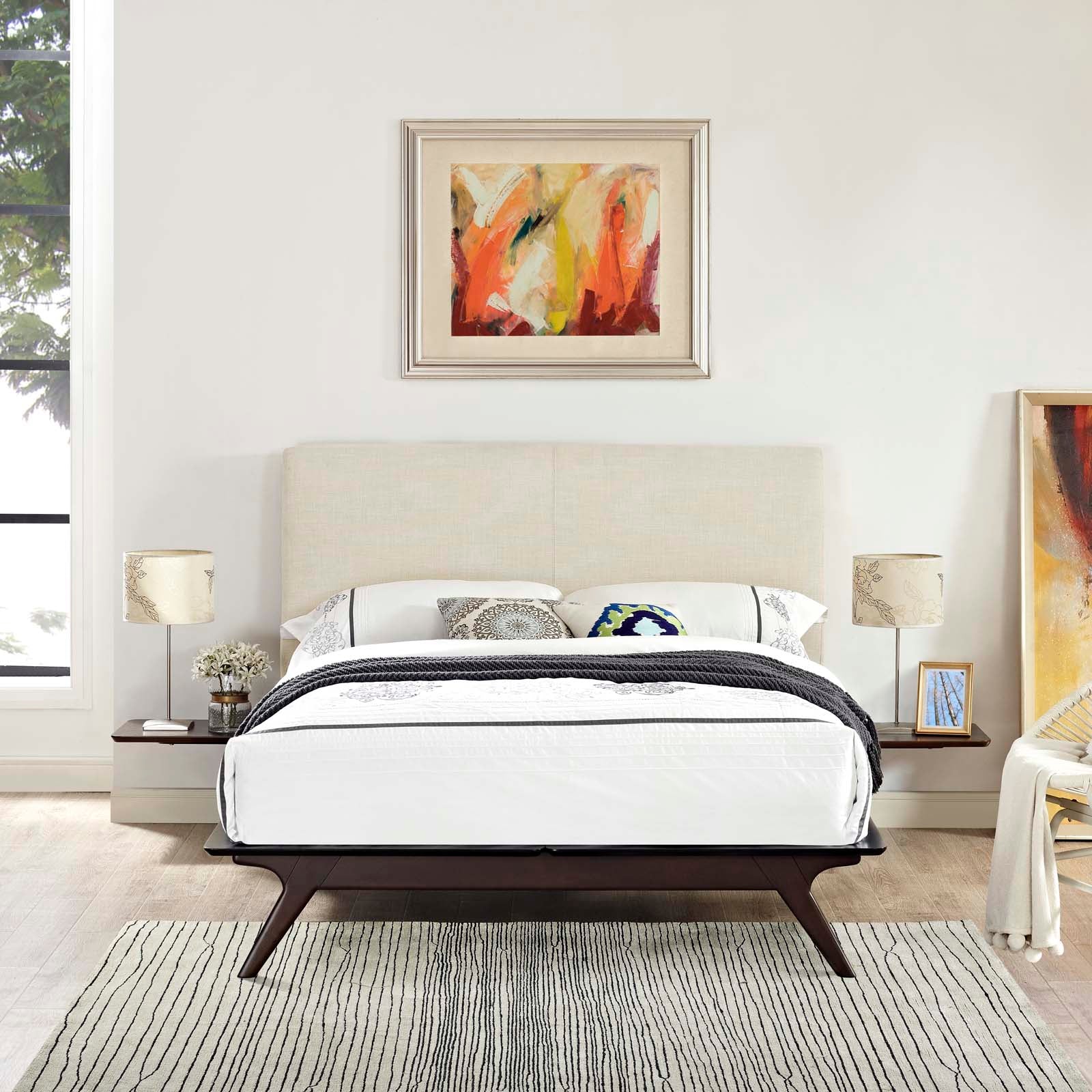 Transform your ordinary bedroom arrangements into a more compelling décor with the Tracy bedroom set. The Tracy bed, with its open design and platform leg support, proves that elegance doesn’t need to come at the expense of simplicity. Finely upholstered with a foam padded fabric headboard, Tracy is an easy to maintain toffee brown stained piece that admirably delivers both comfort and style. Tracy requires assembly and should be spot cleaned only. Headboard included. Queen size mattress not included. The Tracy queen size platform bed does not need a box spring. Set Includes: One - Tracy Queen Bed Frame Two - Tracy Side Table